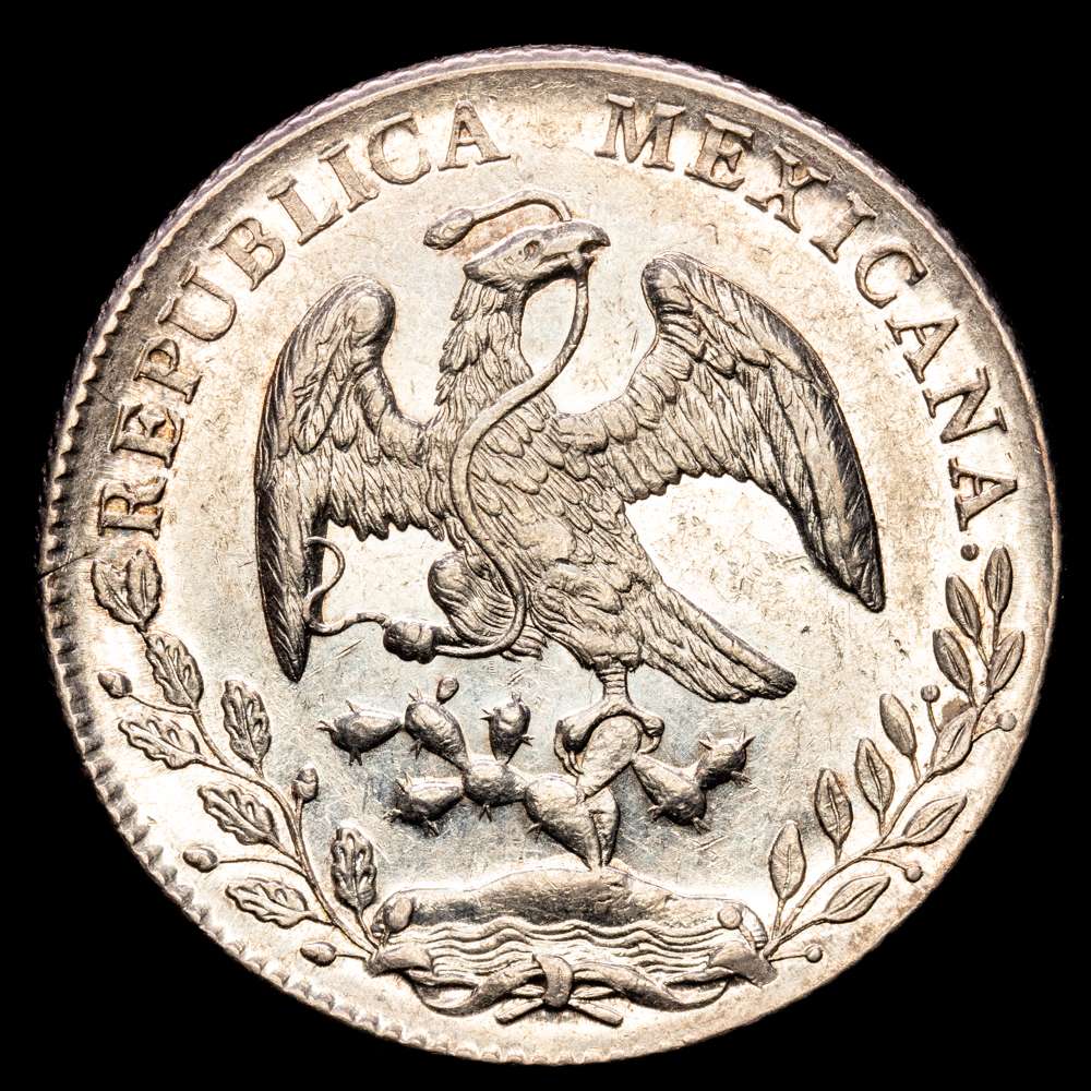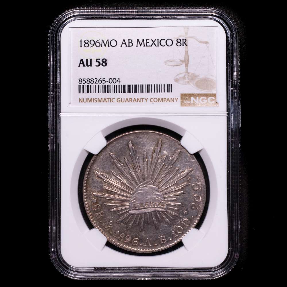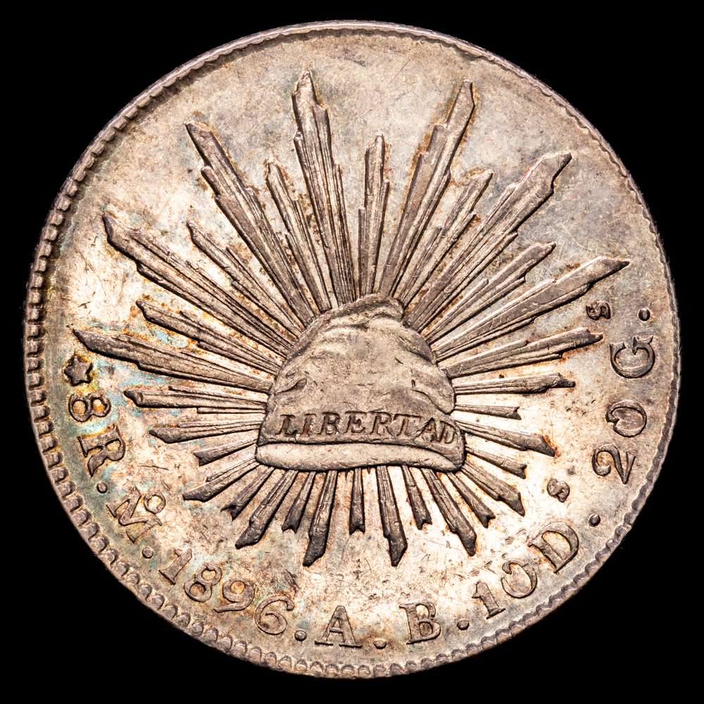 México. 8 reales. 1896. México. AB. (Km-377.10). Ag. Encapsulado por NGC como AU 58. Bella pátina.