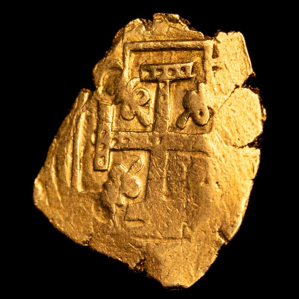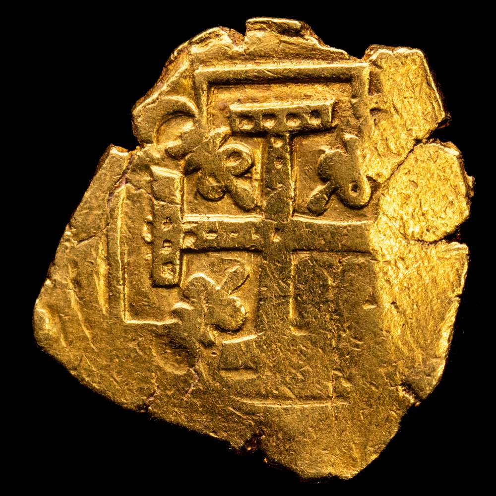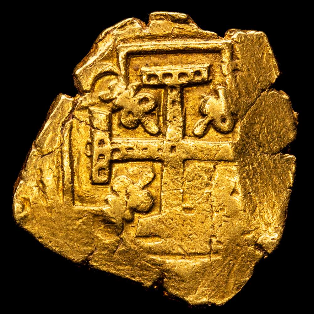 Es visible la parte superior de la marca de ceca oXM, así como aproximadamente dos terceras partes de la sección superior del escudo y gran parte de la cruz. Posiblemente una acuñación de la década de 1680’s por el estilo de los elementos del escudo. El cospel presenta pequeñas fisuras en los bordes, generadas por la fuerza del golpe. Peso: 13.33 gramos. Rara. VF.