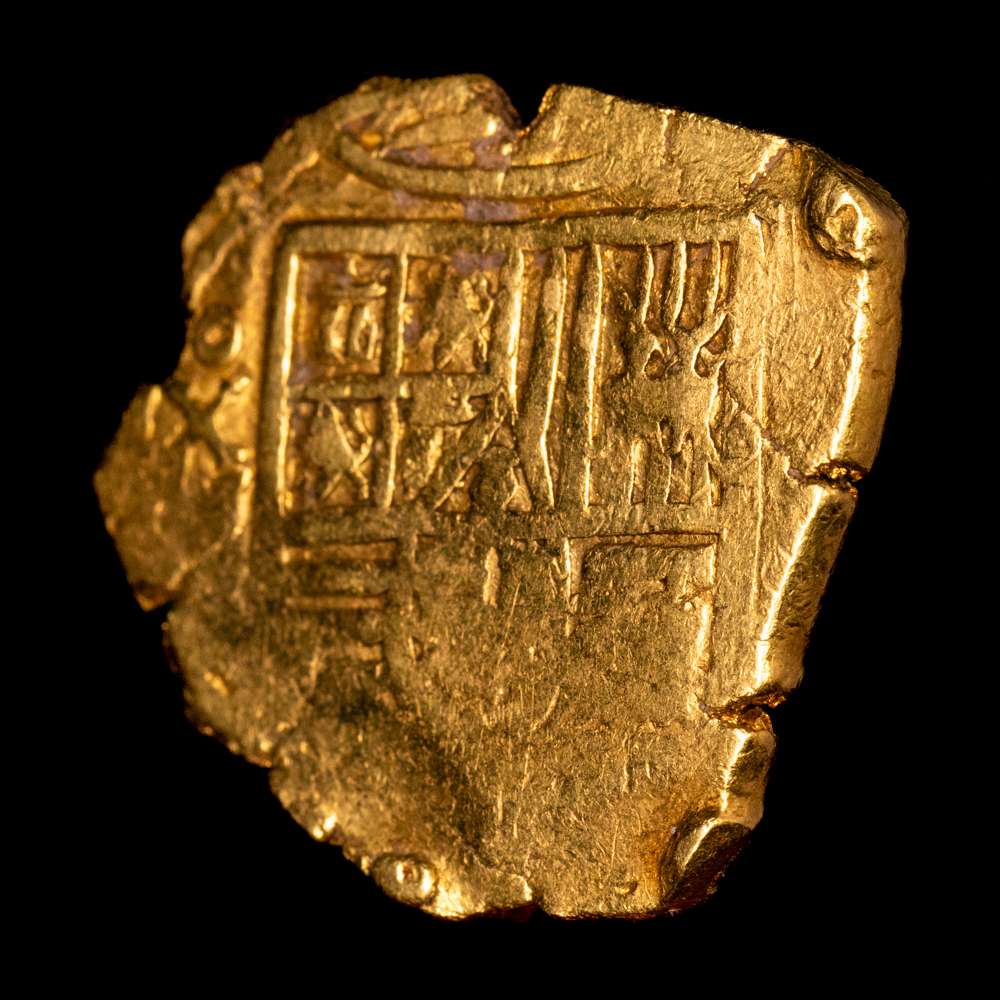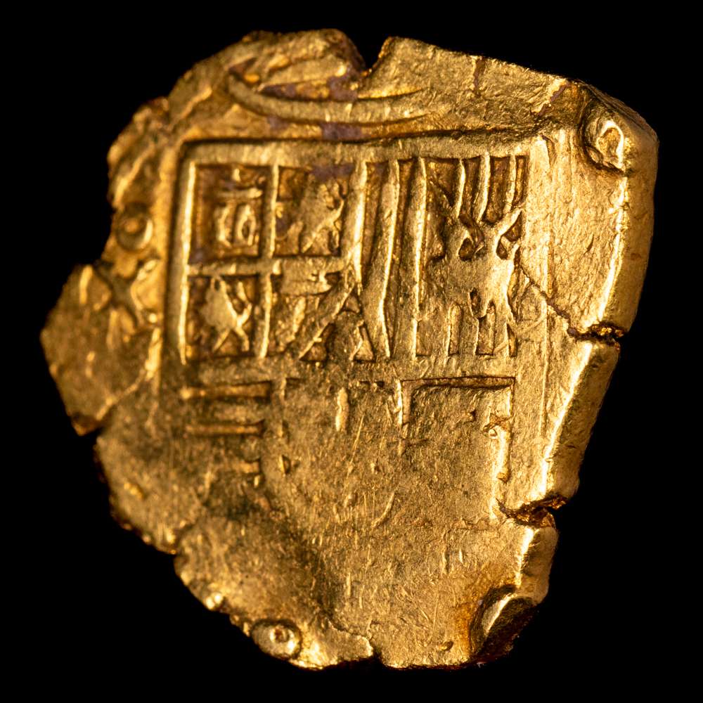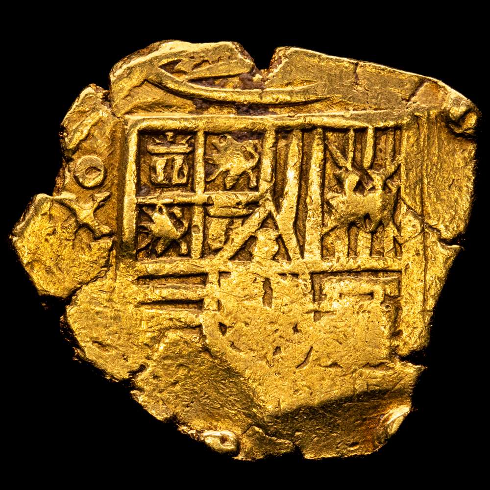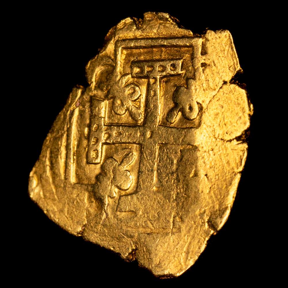 Es visible la parte superior de la marca de ceca oXM, así como aproximadamente dos terceras partes de la sección superior del escudo y gran parte de la cruz. Posiblemente una acuñación de la década de 1680’s por el estilo de los elementos del escudo. El cospel presenta pequeñas fisuras en los bordes, generadas por la fuerza del golpe. Peso: 13.33 gramos. Rara. VF.