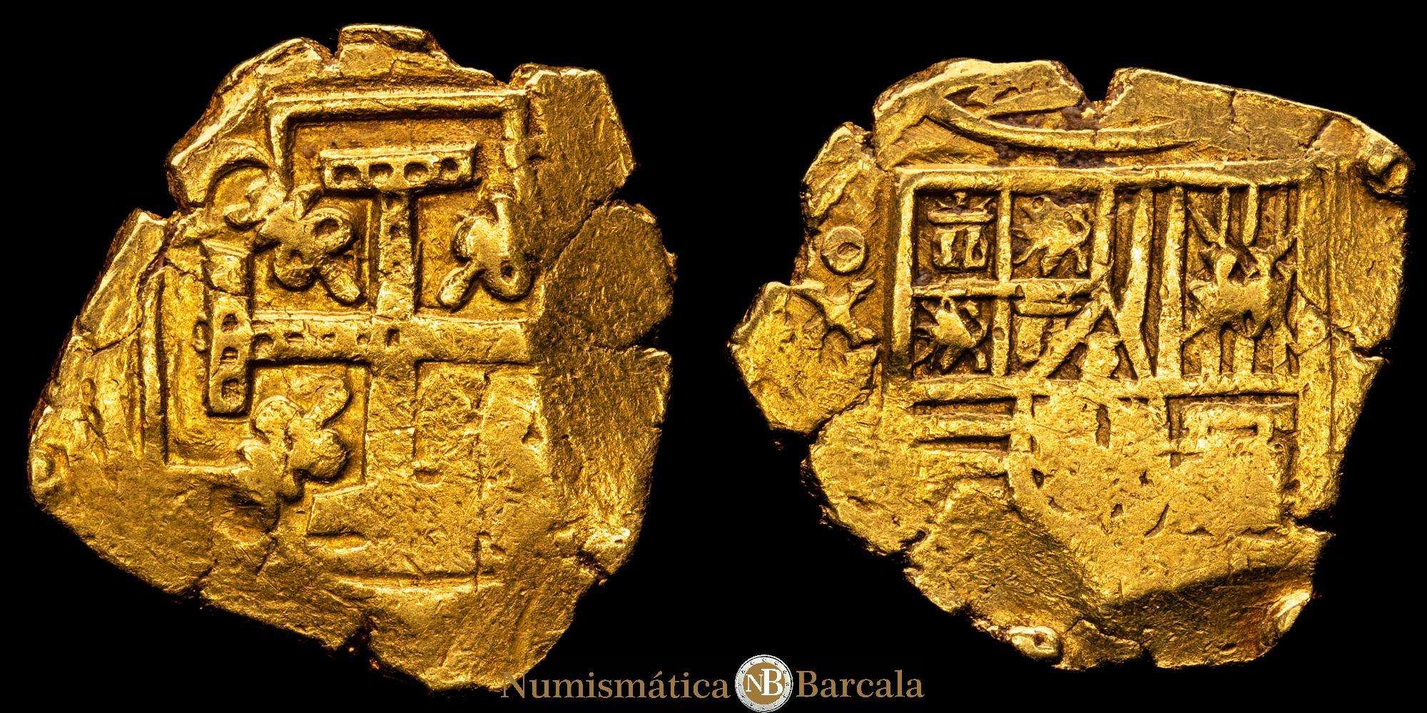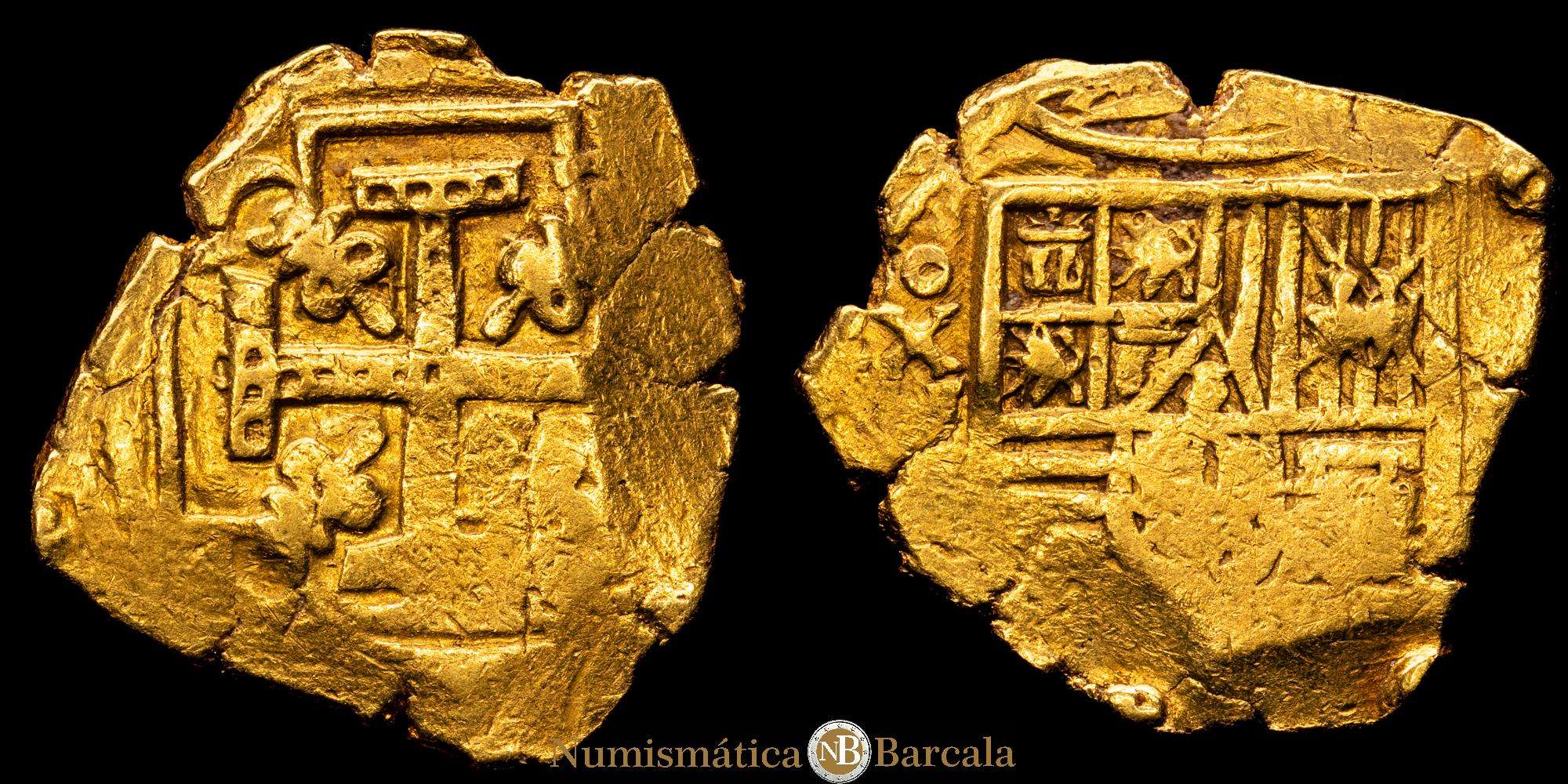 MÉXICO. CARLOS II. KM-54 (Calicó tipo 163) – 4 Escudos (1679-1699) oMX (L). El primer diseño acuñado en oro en la ceca de México, conocido como “cruz enjoyada”, se distingue por la ornamentación de pequeños cuadros que lo diferencian de las acuñaciones de las demás cecas. Aunque los ejemplares con este diseño suelen catalogarse hasta 1694, ya que posteriormente se comenzó a utilizar el diseño de cruz plana, se conocen piezas con esta característica hasta 1699.