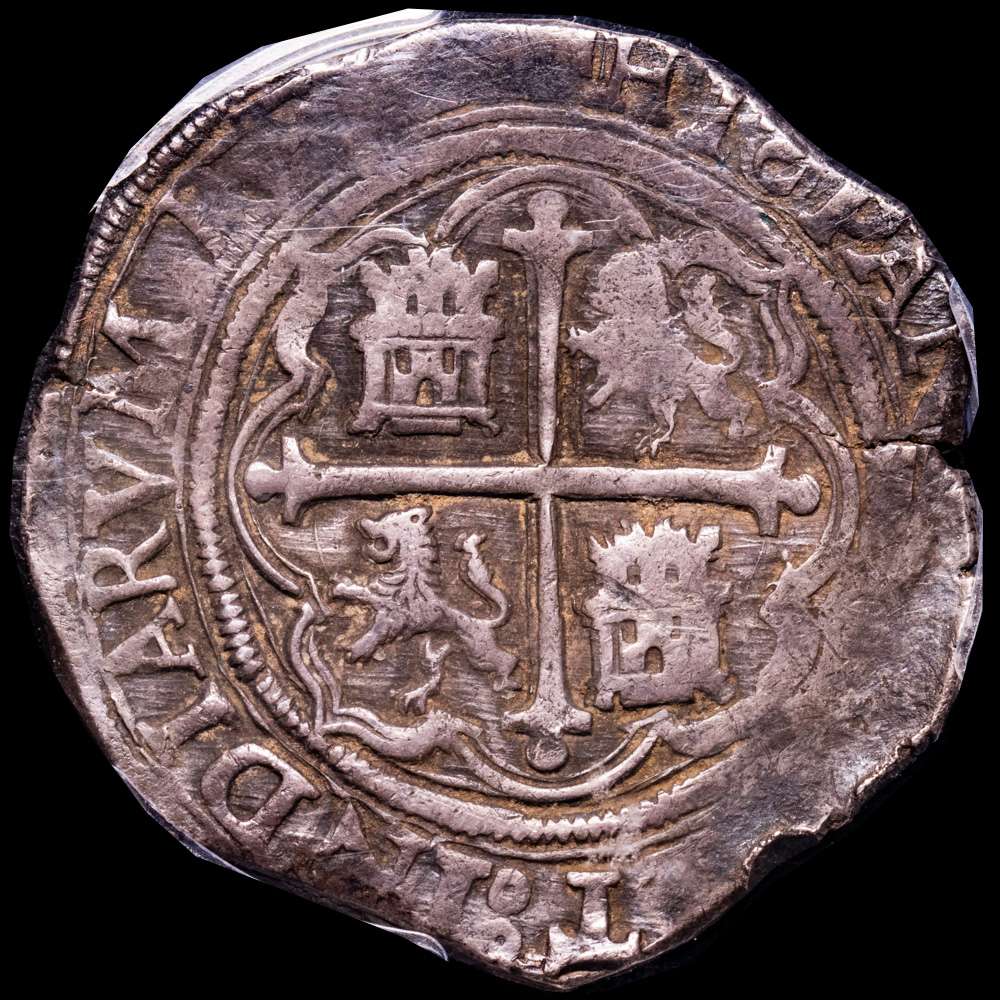 KM-36; Cal-505. Peso: 13,50 gms. Una moneda Cob bien acuñada sobre un flan irregular, escudo y cruz completos, que muestra claramente la marca de ceca y el ensayador a la izquierda del escudo. S invertida en el nombre “PHILIPPVS”, variante rara. Campos originales agradables y tono profundo en toda su extensión.