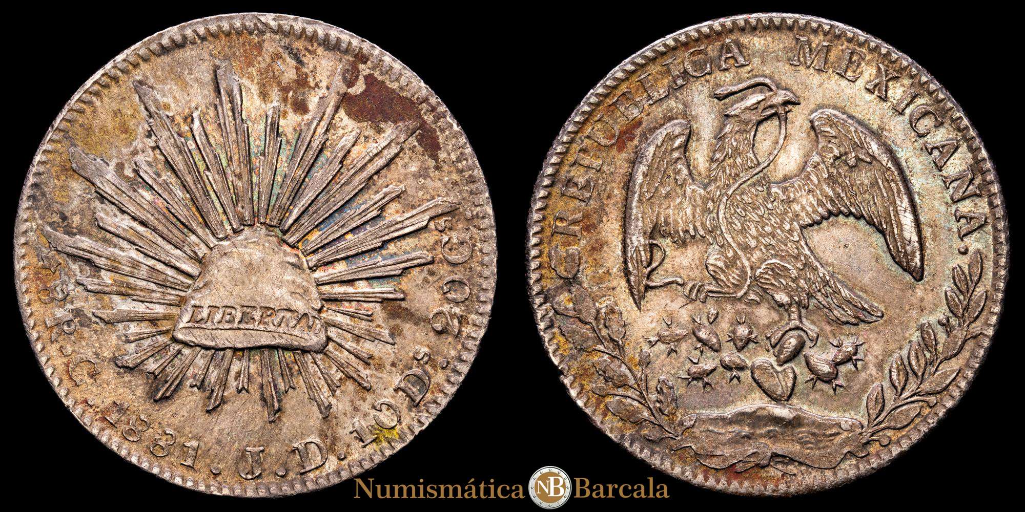 México. KM-377.3 (D-P-Cn40) – 8 Reales 1881 Culiacán C JD. Ag. 27,05 gramos. Variedad con marca de ceca como