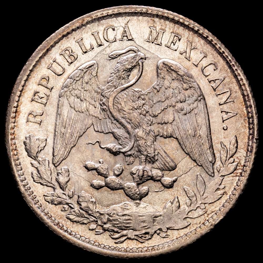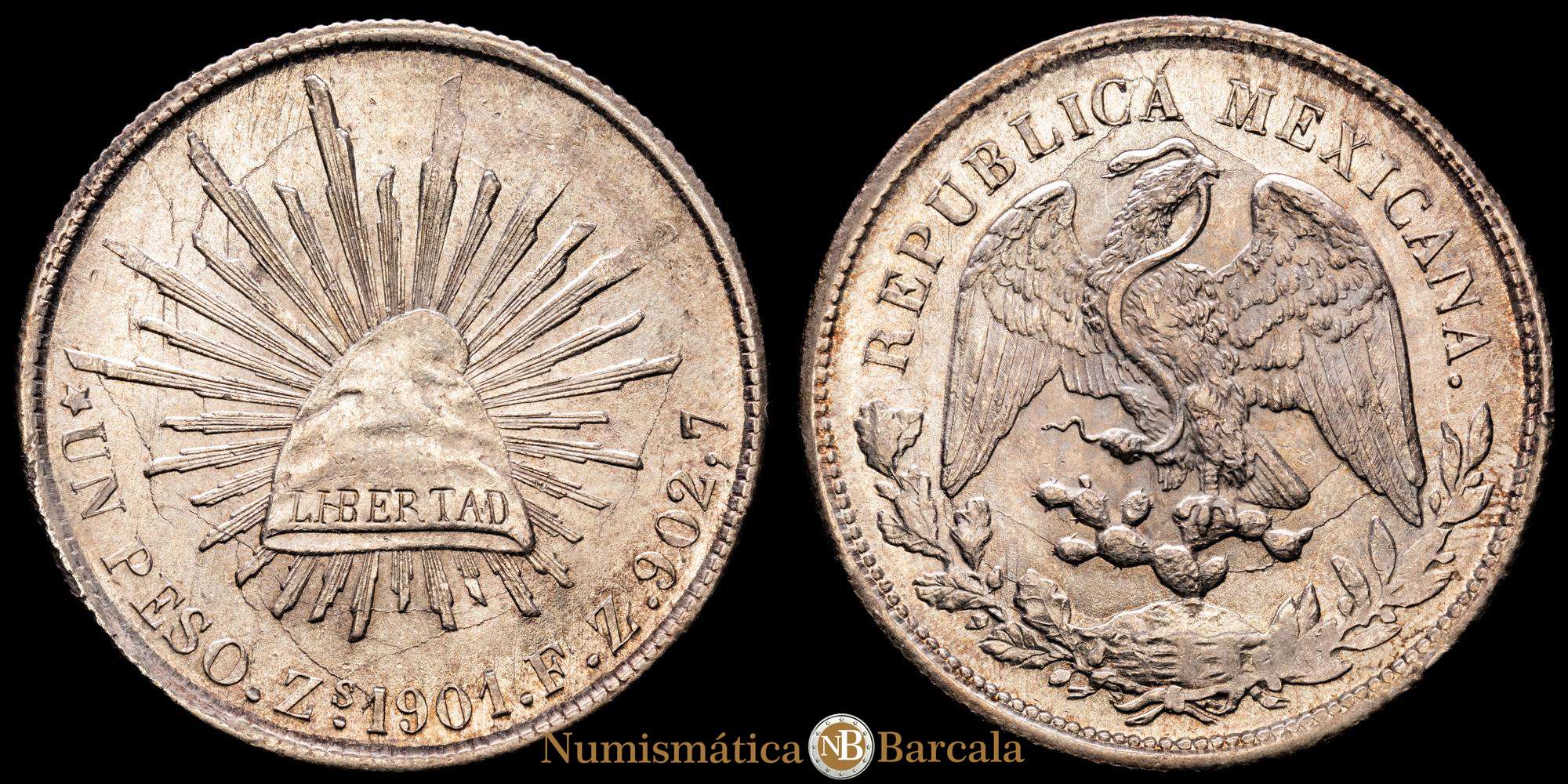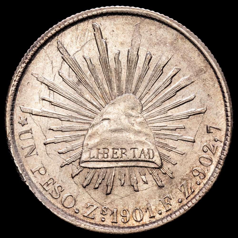 , Segunda República. 1867-1905. Peso AR (39 mm, 27.11 g). Ceca de Zacatecas. Fechado 1901 Zs FZ. Águila de pie sobre un cactus, cabeza a la derecha, alas extendidas, serpiente sujetando en el pico y la garra derecha; todo sobre corona de laurel y roble / gorro de la Libertad; gloria de rayos al fondo. BW 258.13; KM 409.3. UNC-.