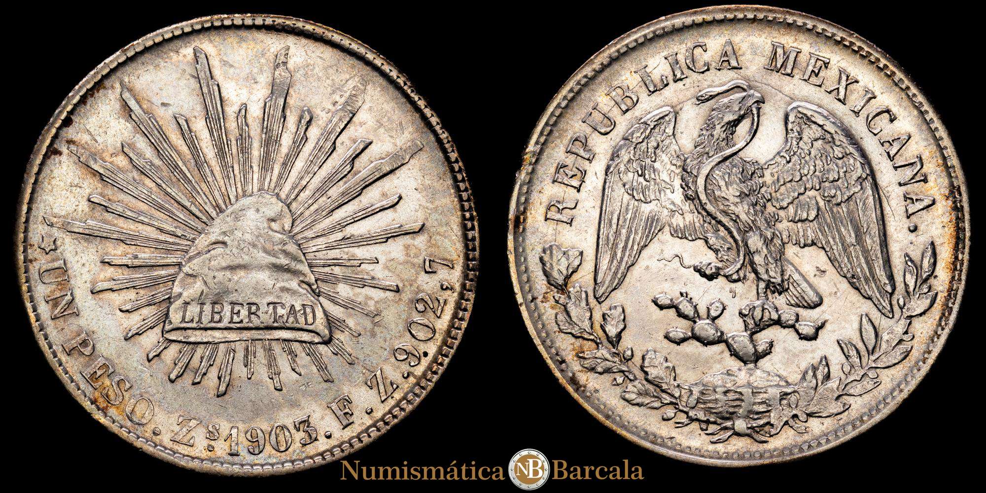 MÉXICO. Zacatecas. Peso, 1903/2-ZsFZ. KM-409.3. (27,10 gramos). Tonificado y atractivo. XF+. Escasa.