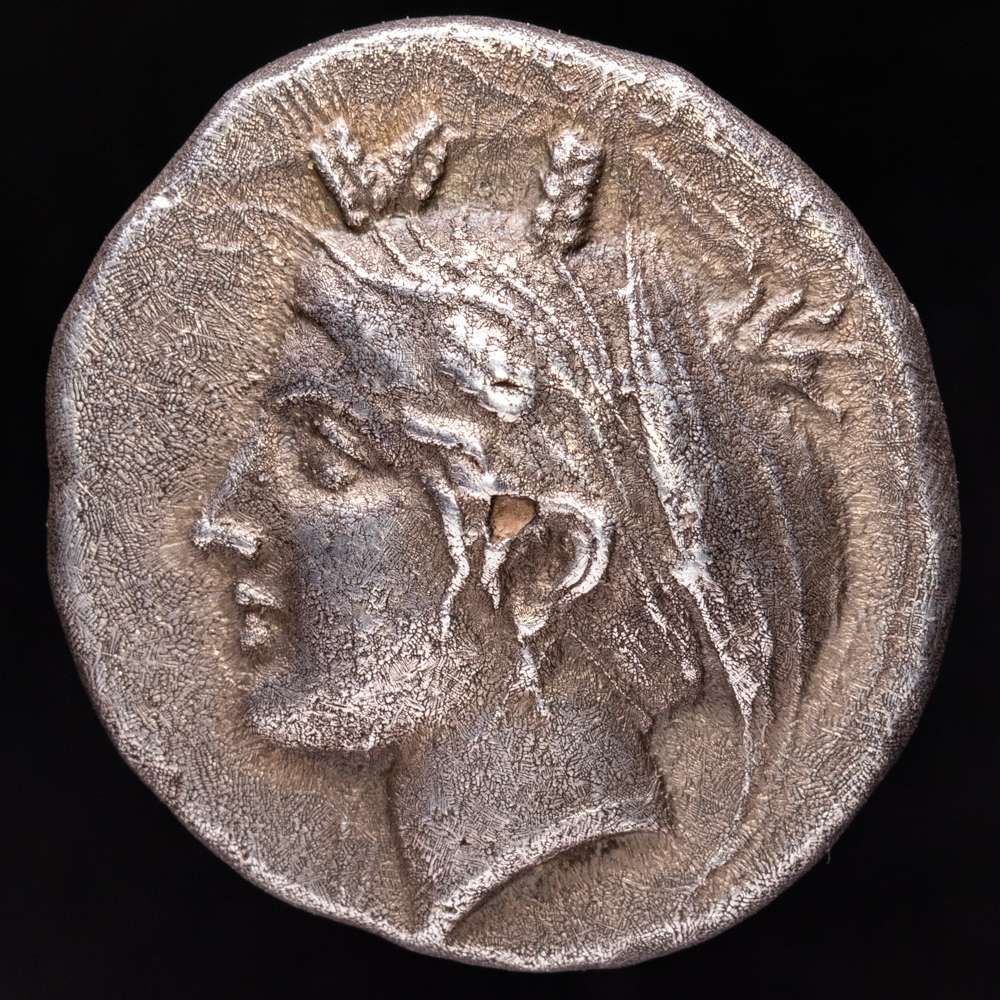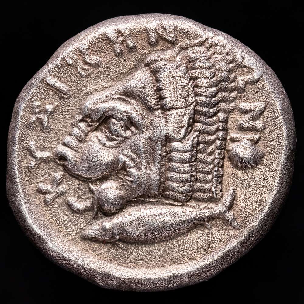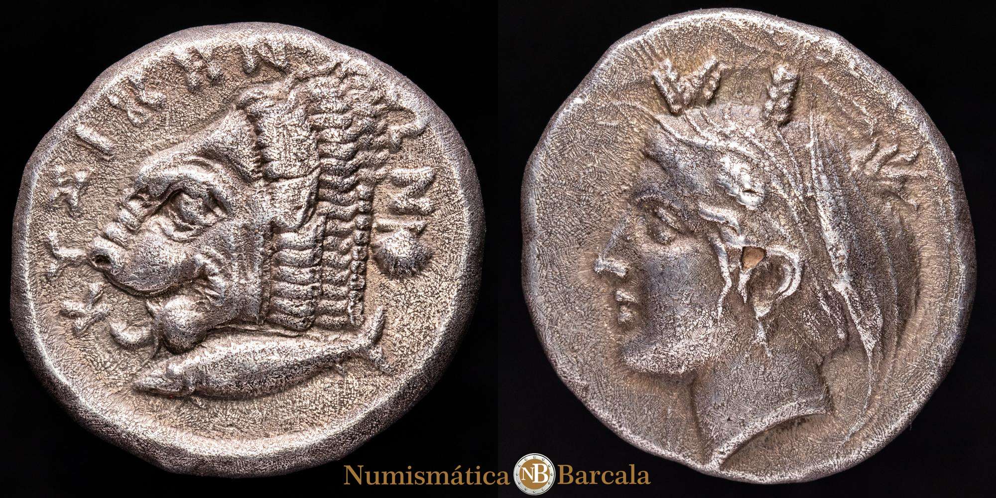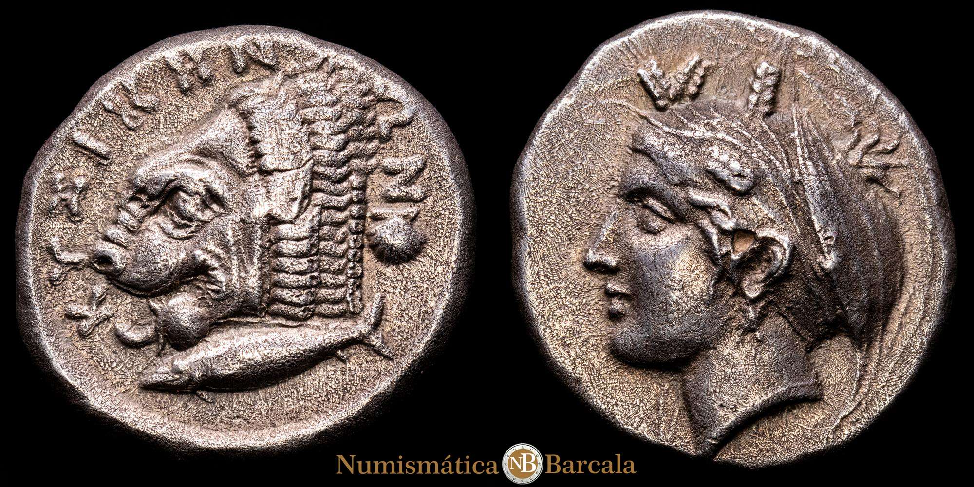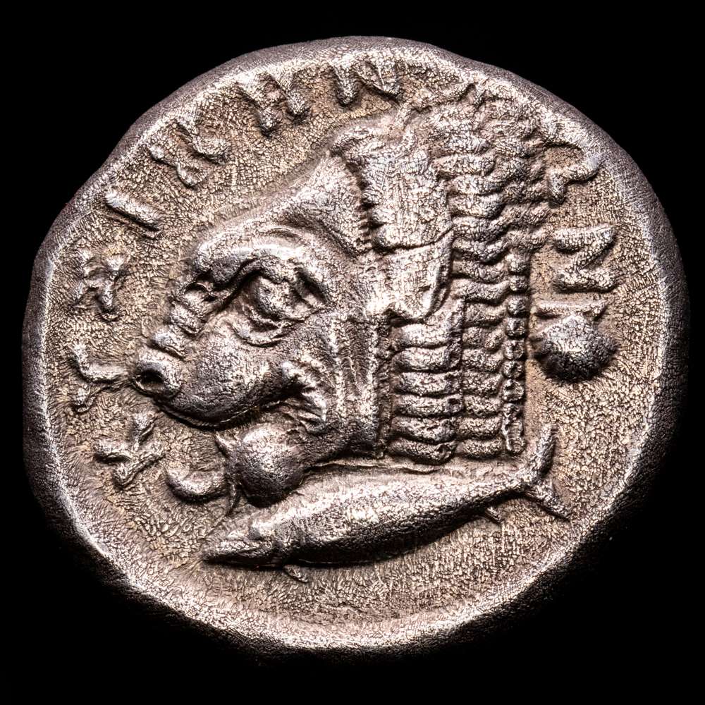 Mysia. Kyzikos. Tetradracma. 380-340 a.C. (Sng France-No cita). (Von Fritze-No cita). Anv.: Cabeza de Core Soteira a la izquierda, con pendiente de un solo pendiente, el pelo en esfendone cubierto con un velo, dos espigas de grano en el pelo; ΣΩ(TEIPA) encima. Rev.: Cabeza de león a la izquierda, un atún a la izquierda debajo y una concha de vieira a la derecha; KYZIKHNΩN alrededor. Ag. 14,73 g. Pátina. Rara. EBC-.