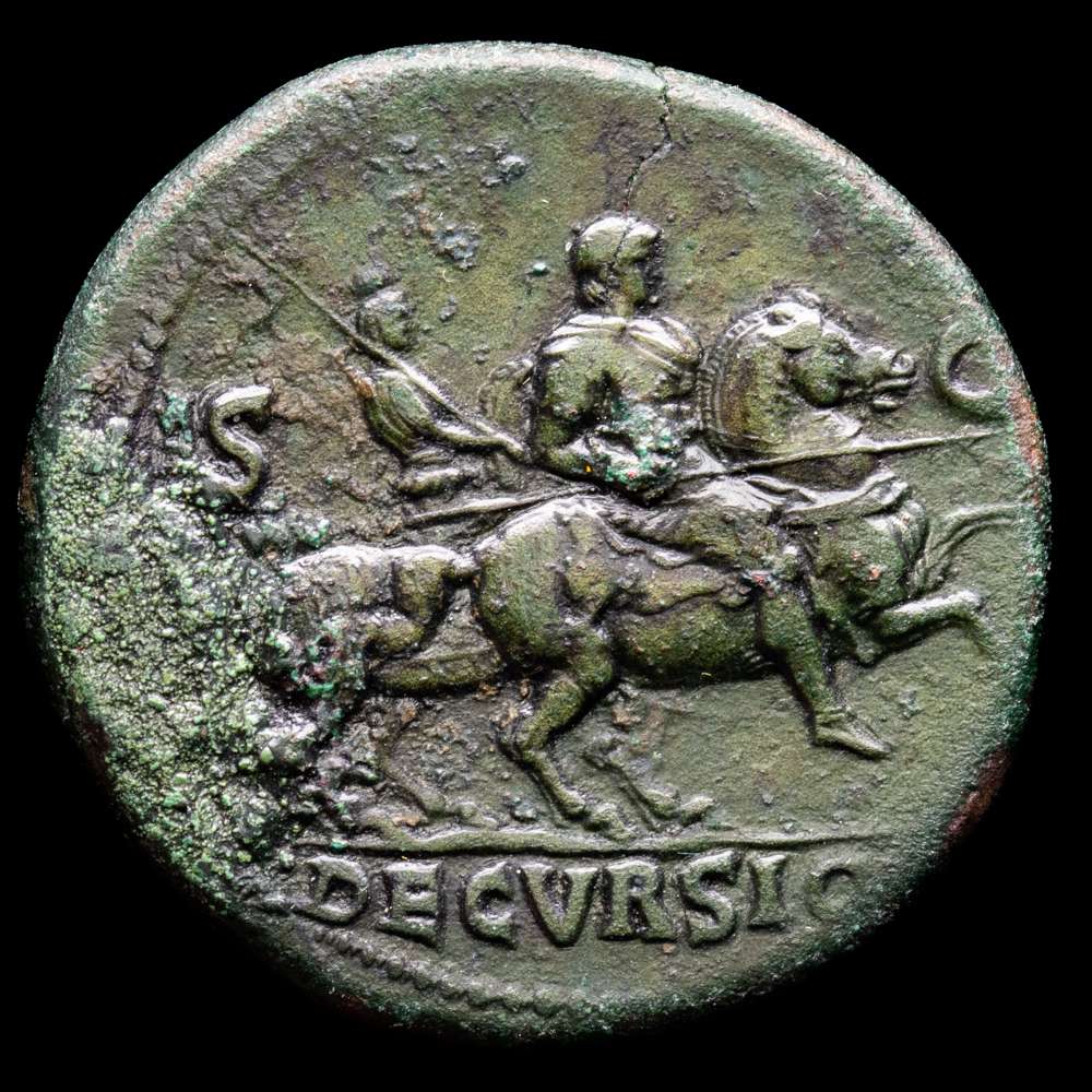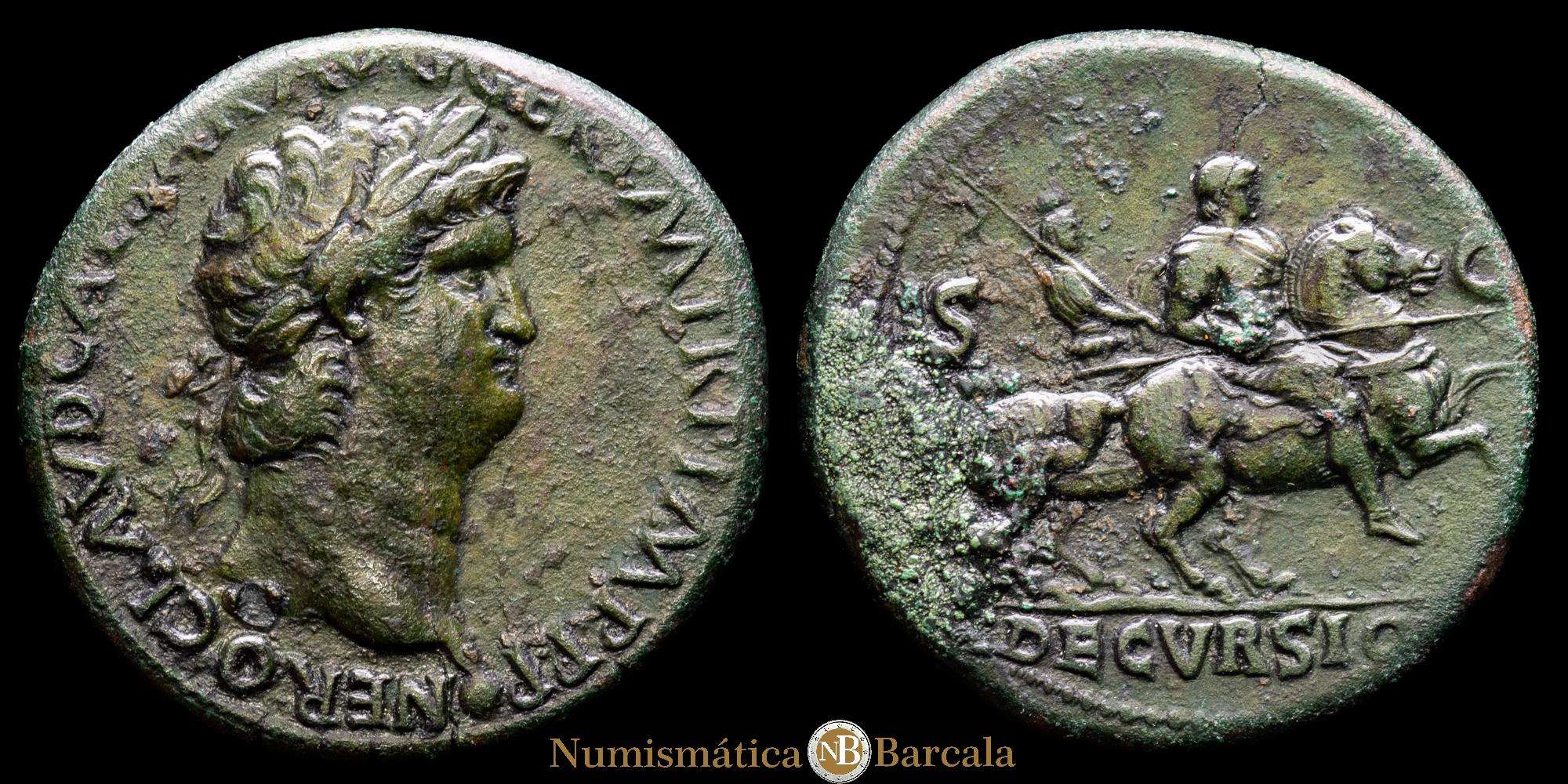 NERÓN (54-68). Sestercio. Lugdunum. Cabeza laureada a la derecha. Rev.: SC / DECVRSIO. Nerón a caballo, encabritado a la derecha, portando una lanza; a la izquierda, un soldado a caballo, sosteniendo el vexillum sobre el hombro. RIC² 396. (18,23 g. 34 mm). VF+.