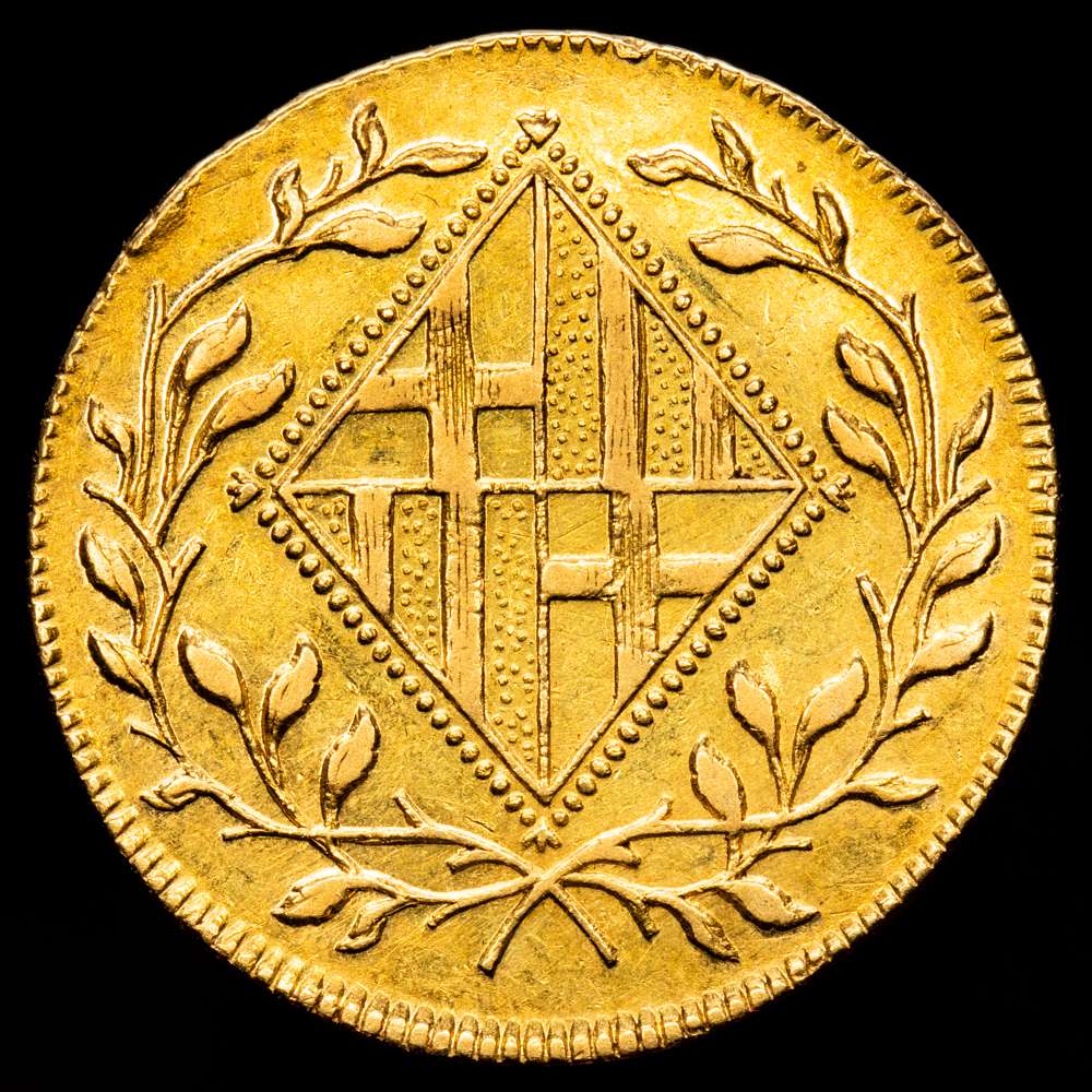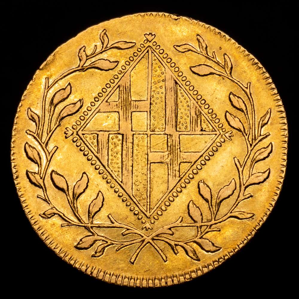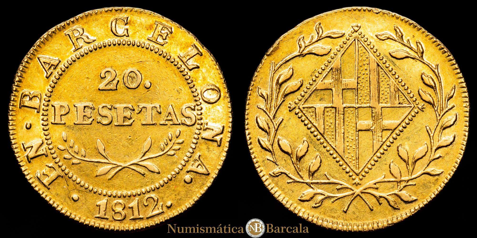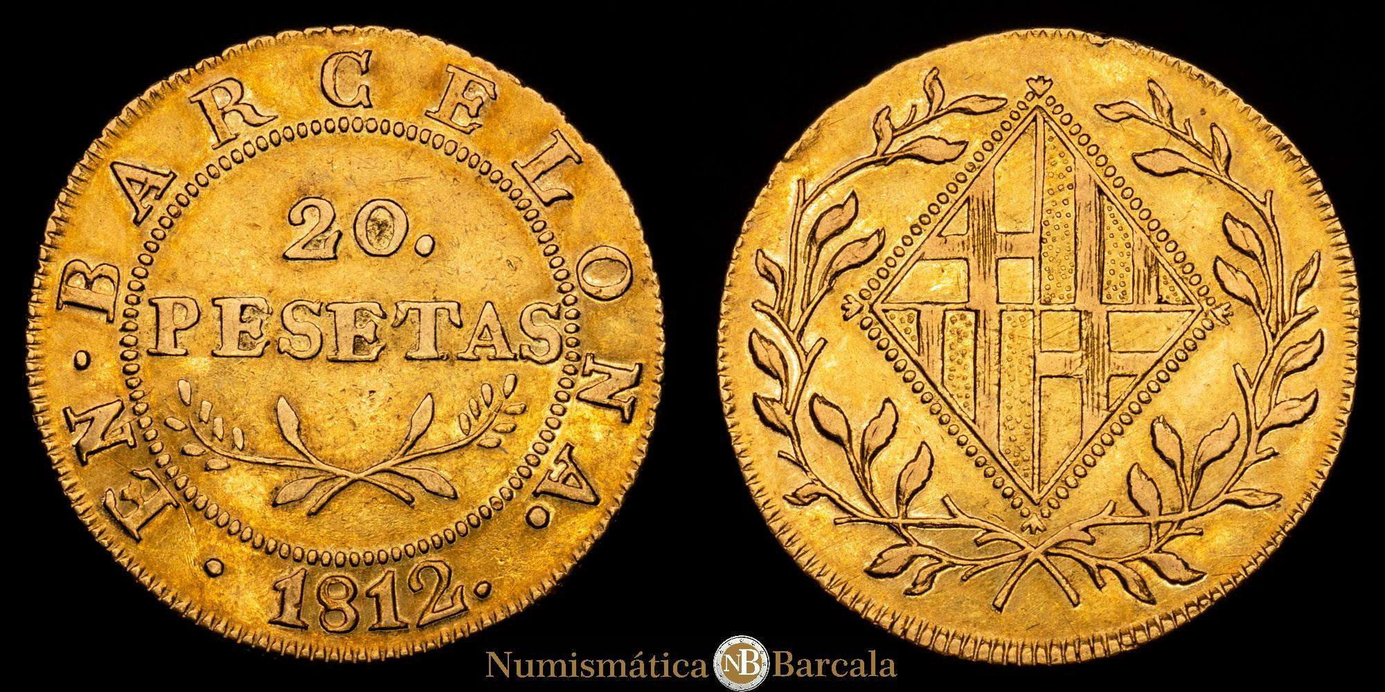 OCUPACIÓN NAPOLEÓNICA DE CATALUÑA. 20 pesetas. 1812. Barcelona. AU 6,69 g. 22 mm. VI-41; AC-54. Pequeñas marcas. R.B.O. MBC+. Escasa. Ex subasta Soler y Llach 1086 (30-IV-2015), lote 949.