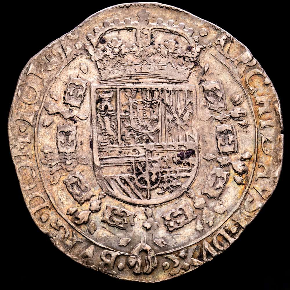 Tournai. Felipe IV 1 Patagón 1631. Ceca de Tournai, (Vti. 1118) (Vanhoudt 645.TO). 28,15 gramos. Marca de ceca de la Torre. Retonada en tonos arcoíris, tipo martillado poco común. MBC+.