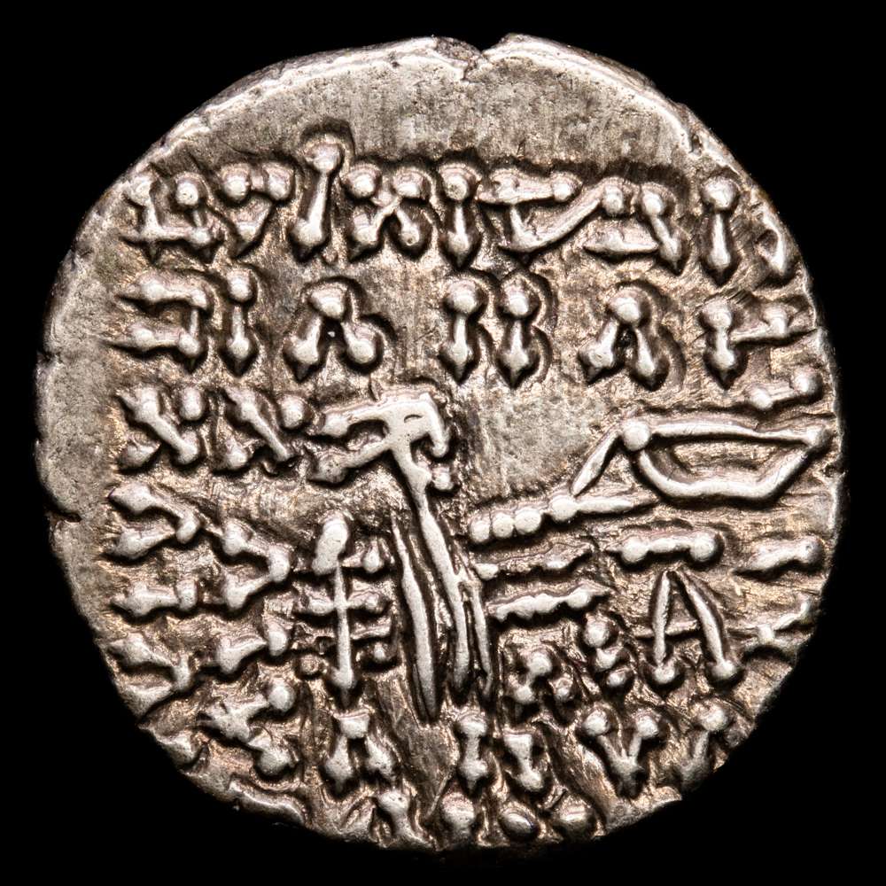Dracma (3,85 g), Ecbatana. Anverso: Busto del rey con tiara y diadema. Reverso: Arsaces con arco en trono, mirando a la derecha, con monograma a la derecha. Sellwood 84.132, Shore 434. XF. Suave pátina.