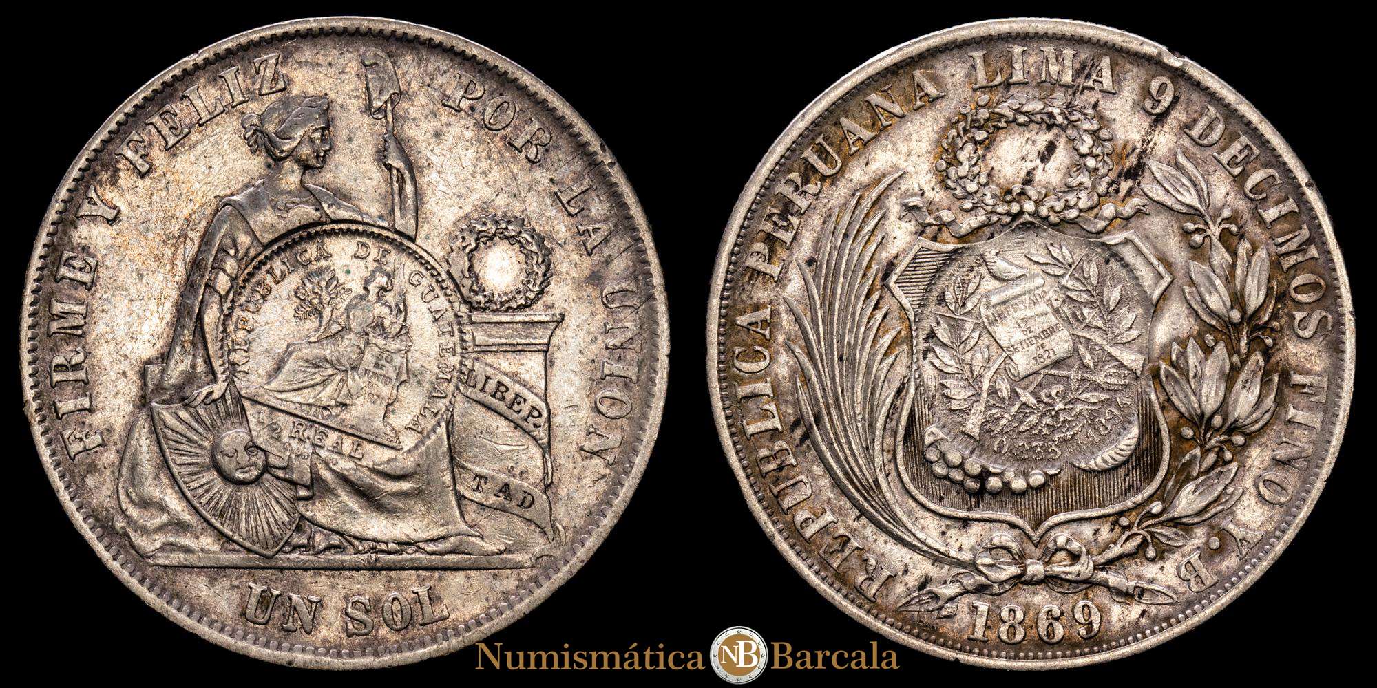 PERÚ. 1 Sol. (Ar. 24,86g/38mm). 1869. Lima YB. (Km#196). Resellos de Guatemala de 1/2 Real de 1894. (De Mey 720 y 721). MBC+.