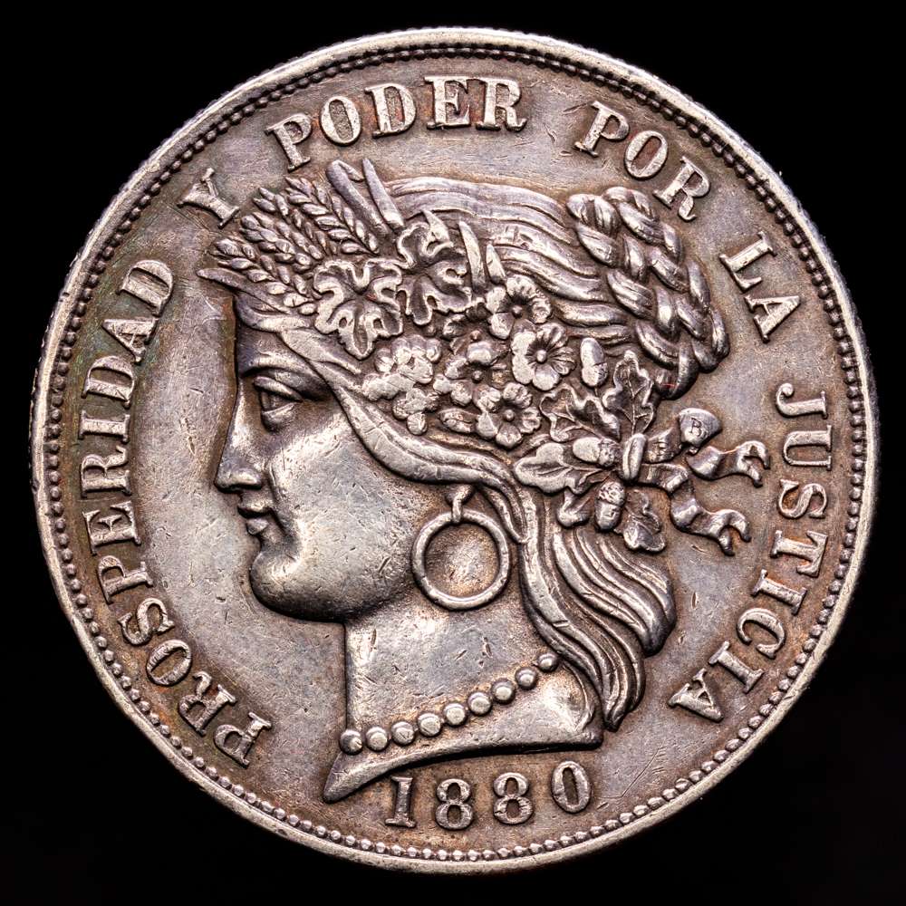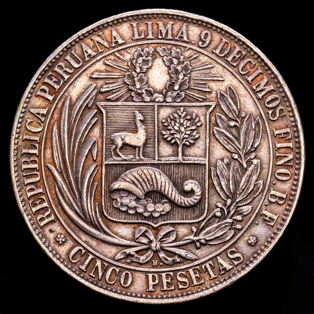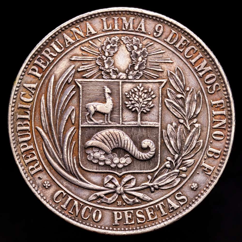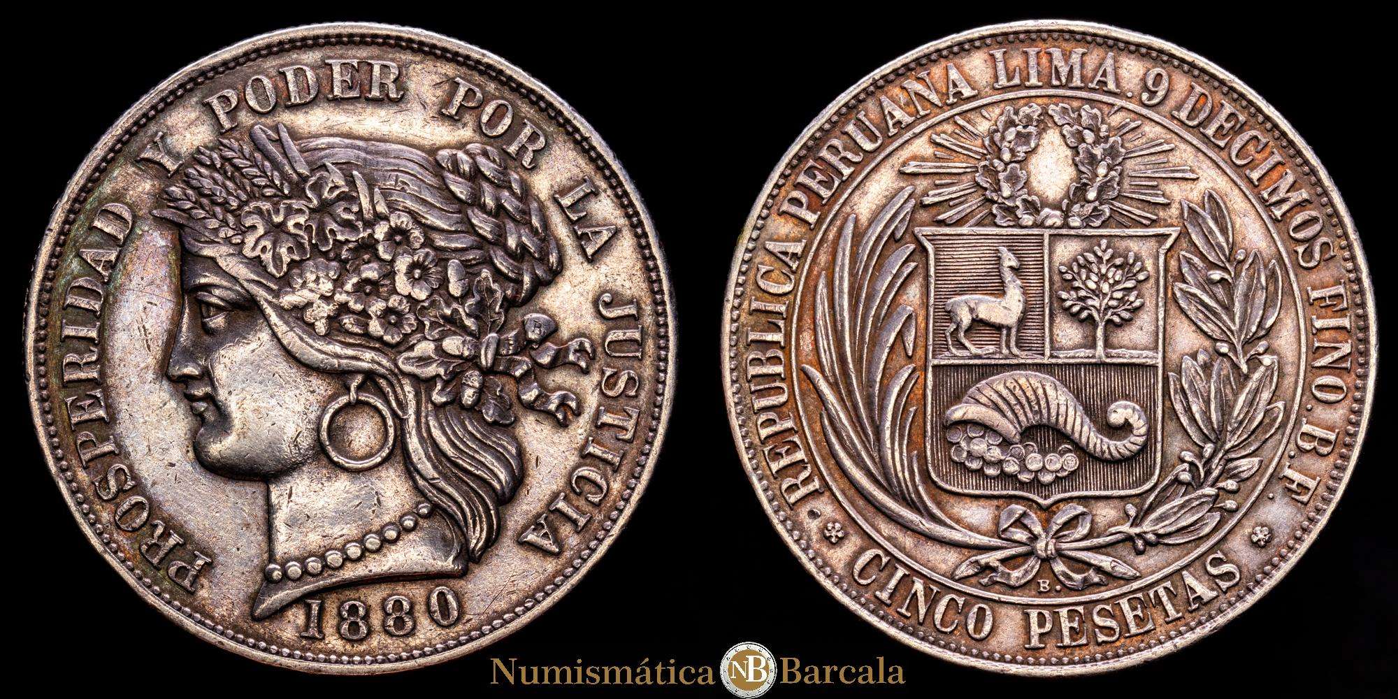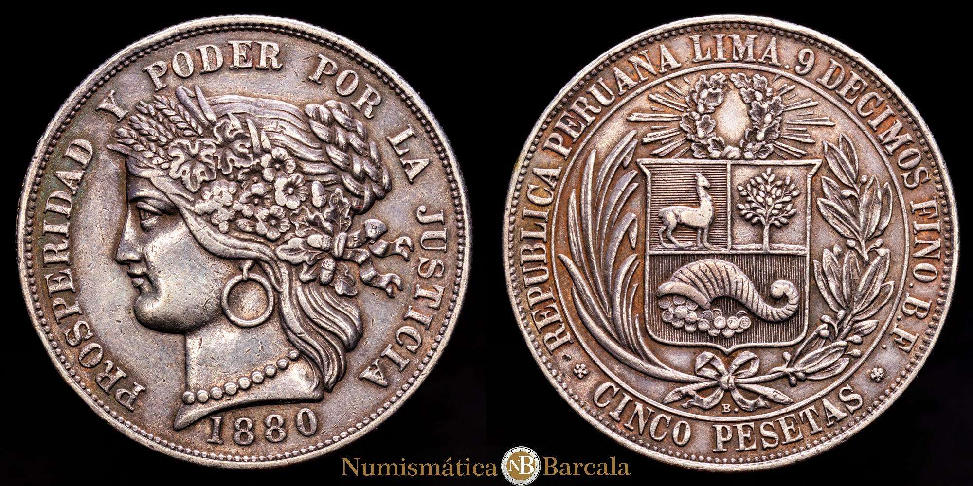 Perú. 5 pesetas. 1880. Lima. BF. (Km-201,2). Ag. 24,89 gramos. Bonita pátina. XF.