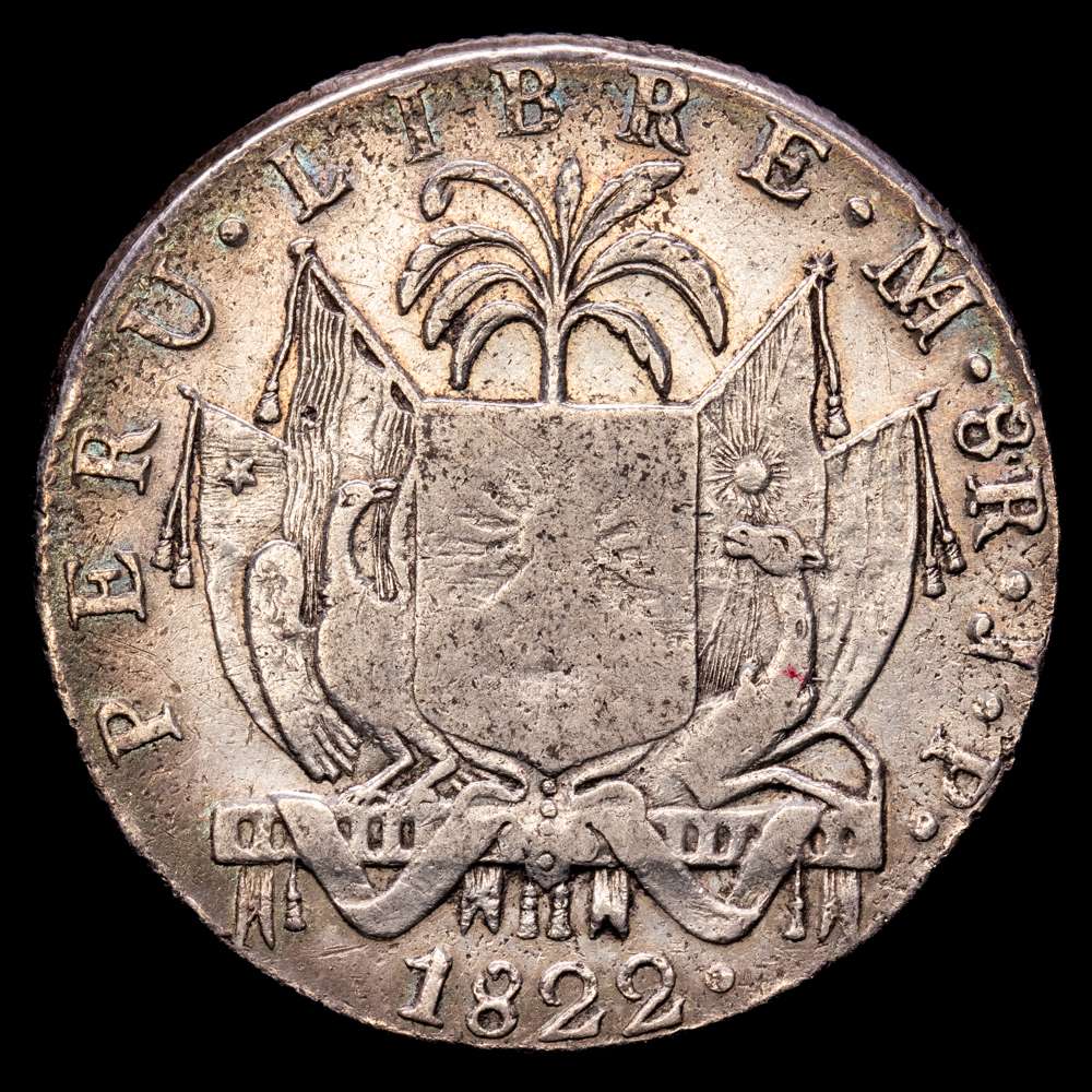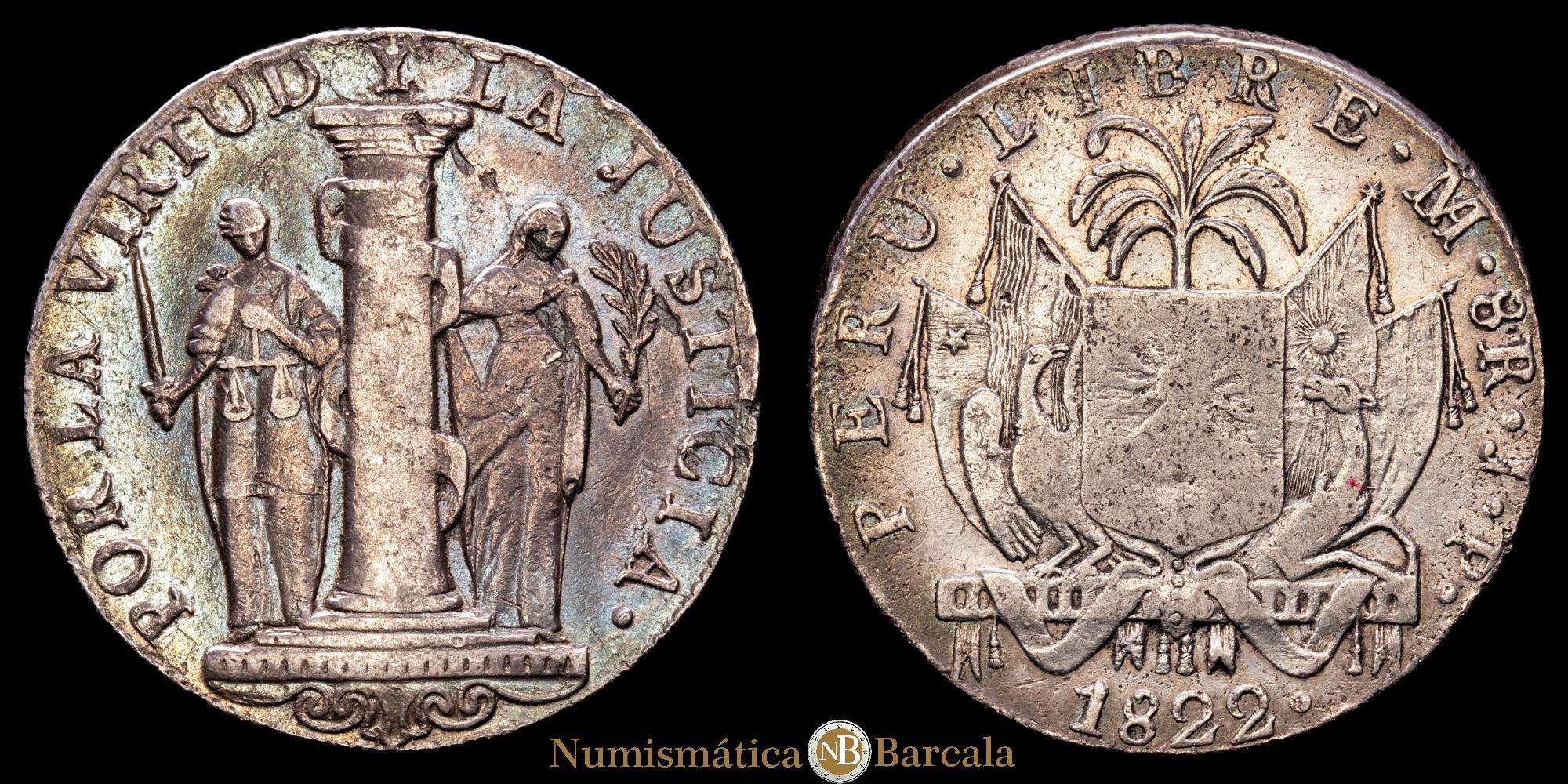 Numismática Barcala > Productos > Perú. 8 reales. 1822. Lima. J.P. (Km-136)(Elizondo-98). Ag. 26,87 gramos. Buen ejemplar. Atractivo tono. XF.