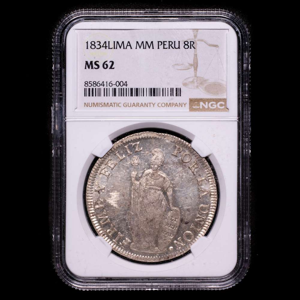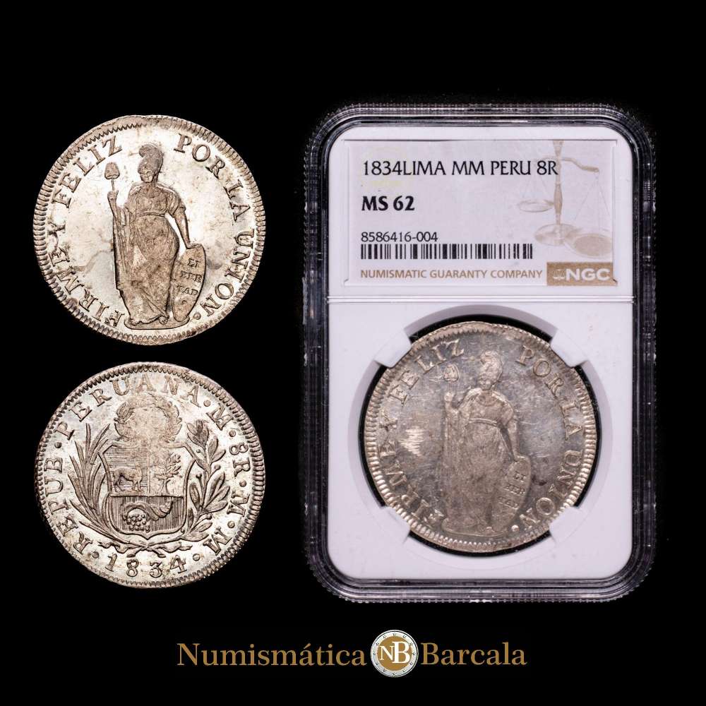 Numismática Barcala > Productos > Perú. 8 reales. 1834. Lima. MM. (Km-142.3). Ag. Suave pátina. Pleno brillo original. Encapsulada por NGC como MS 62.