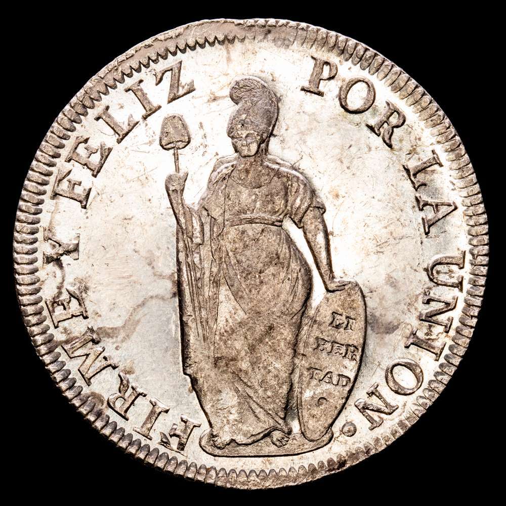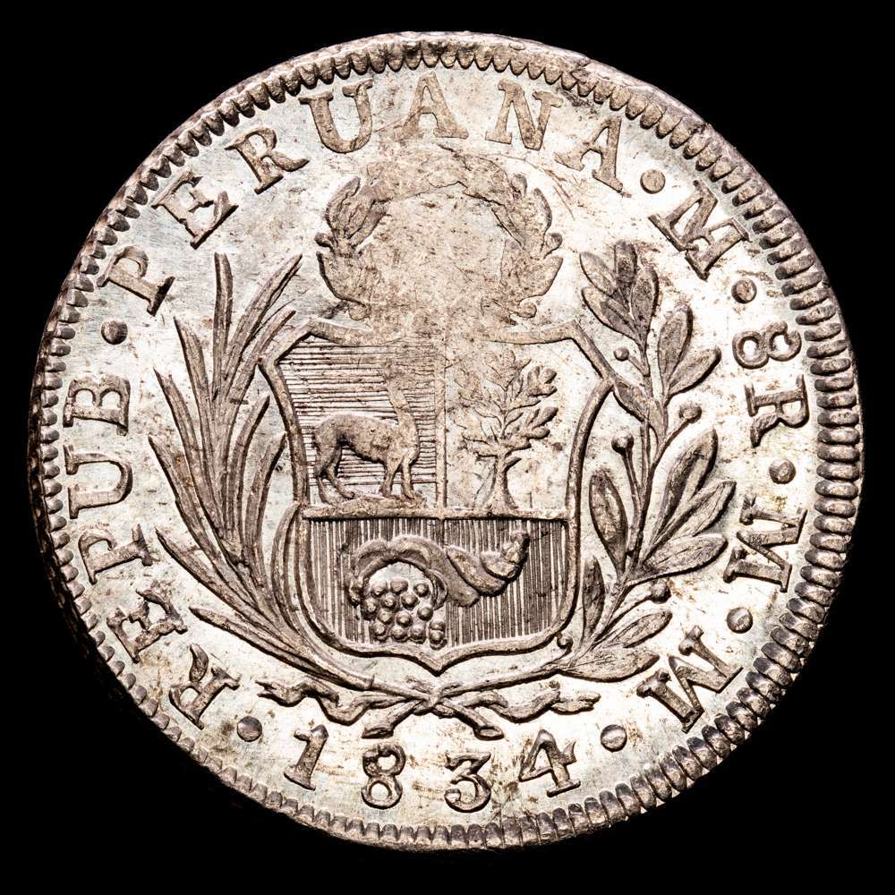 Perú. 8 reales. 1834. Lima. MM. (Km-142.3). Ag. Suave pátina. Pleno brillo original. Muy escasa en esta conservación.
