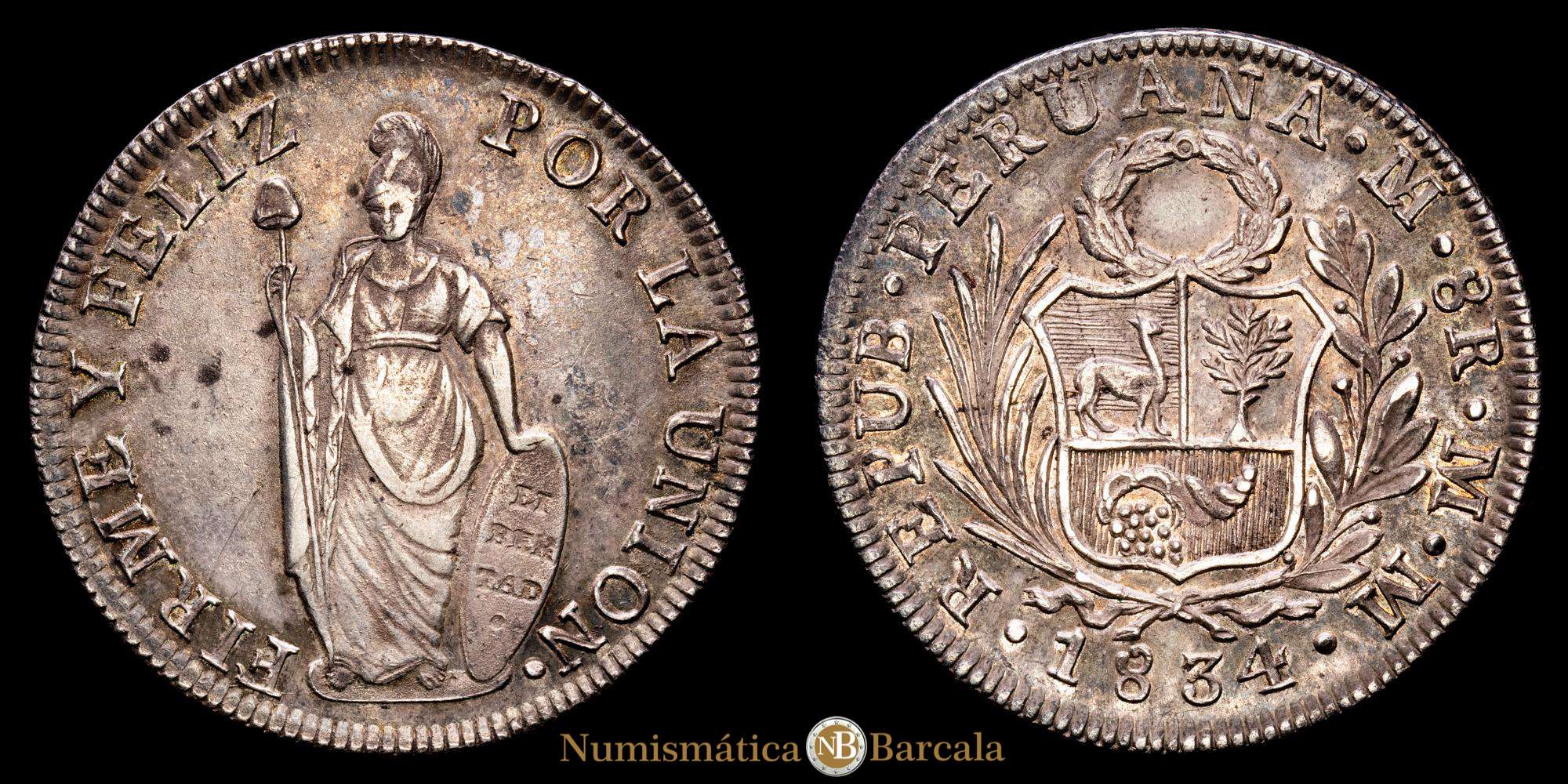 , República. 1822-presente. 8 Reales 1834 (Plata, 40 mm, 27,36 g, 6 h), Lima. FIRME Y FELIZ POR LA UNIÓN. La Libertad de pie, de frente, sosteniendo el gorro frigio en su mano derecha y el escudo en la izquierda. Reverso: REPUB•PERUANA•M•8R•M•M / 1834. Escudo de armas sobre corona. KM 142.3. Hermosa pátina. En excelente estado.