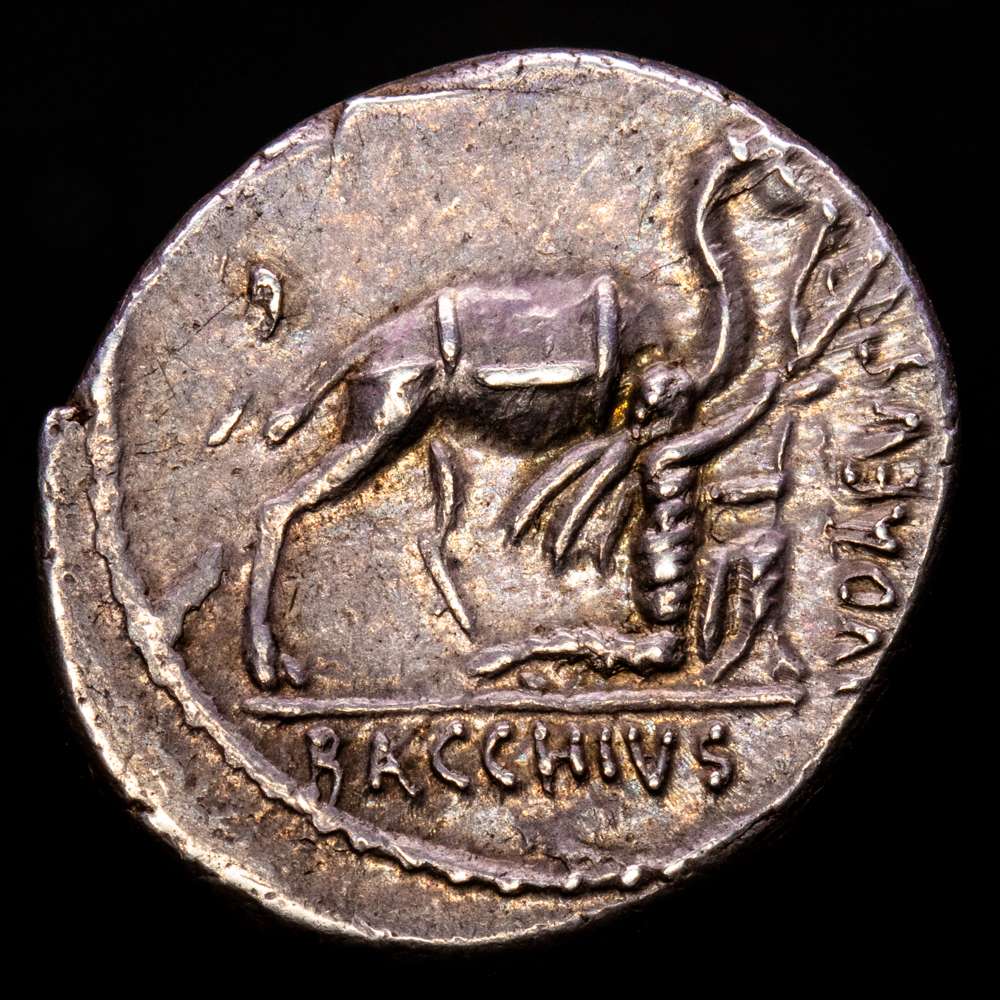 Plautia. A. Plautius. Denario. 55 a.C. Roma. (Ffc-1002). (Craw-431/1). (Cal-1130). Anv.: Cabeza con corona mural, de Cibeles a derecha Ley./ A. PLAVTIVS. AED. CVR. (S.C). Rev.: Bacchius de rodillas a derecha, sosteniendo por las bridas a un camello, en el exergo: BACCHIVS., a derecha: IVDAEVS. Ag. 3,81 g. Bella pátina de monetario antiguo. EBC.