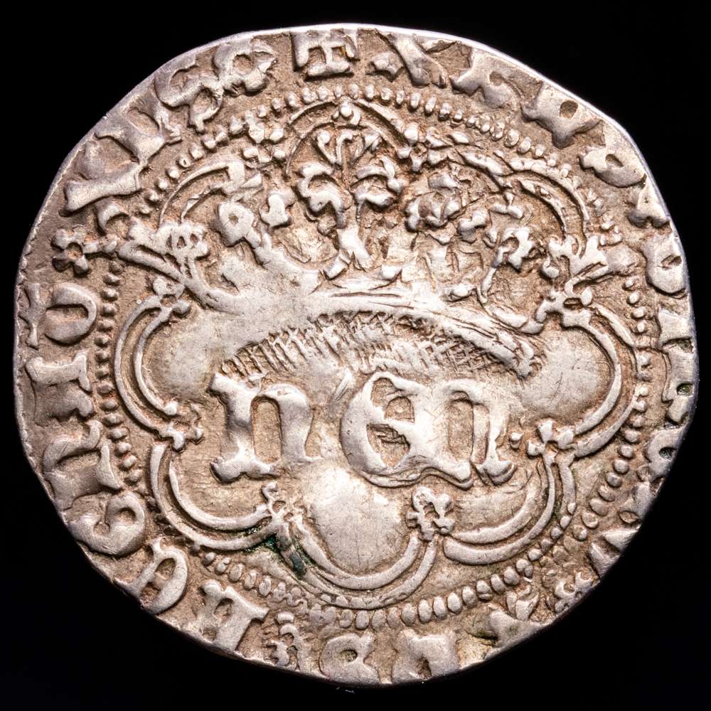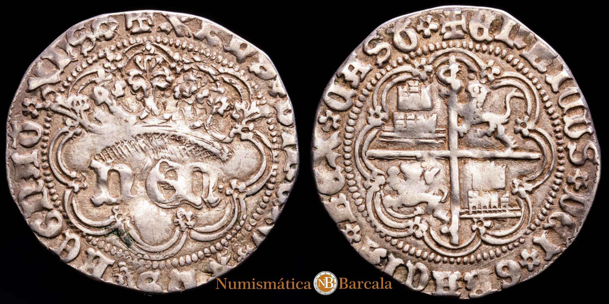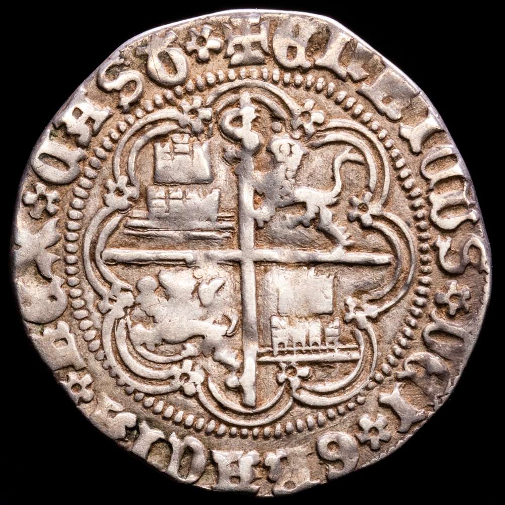 Reino de Castilla y León. Enrique IV (1399-1413). 1 real. Sevilla. (Bautista-903). Anv.: + XPS ✿ VINCIT ✿ XPS ✿ REGNAT ✿ XPS✿ : . Rev.: + ENRICVS ✿ DEI ✿ GRACIA ✿ REX ✿ CAST✿ : . Ag. 3,01 g. S en el extremo superior del eje vertical. Flores en las intersecciones del lobulado. Pátina. MBC+.