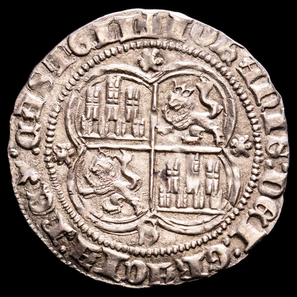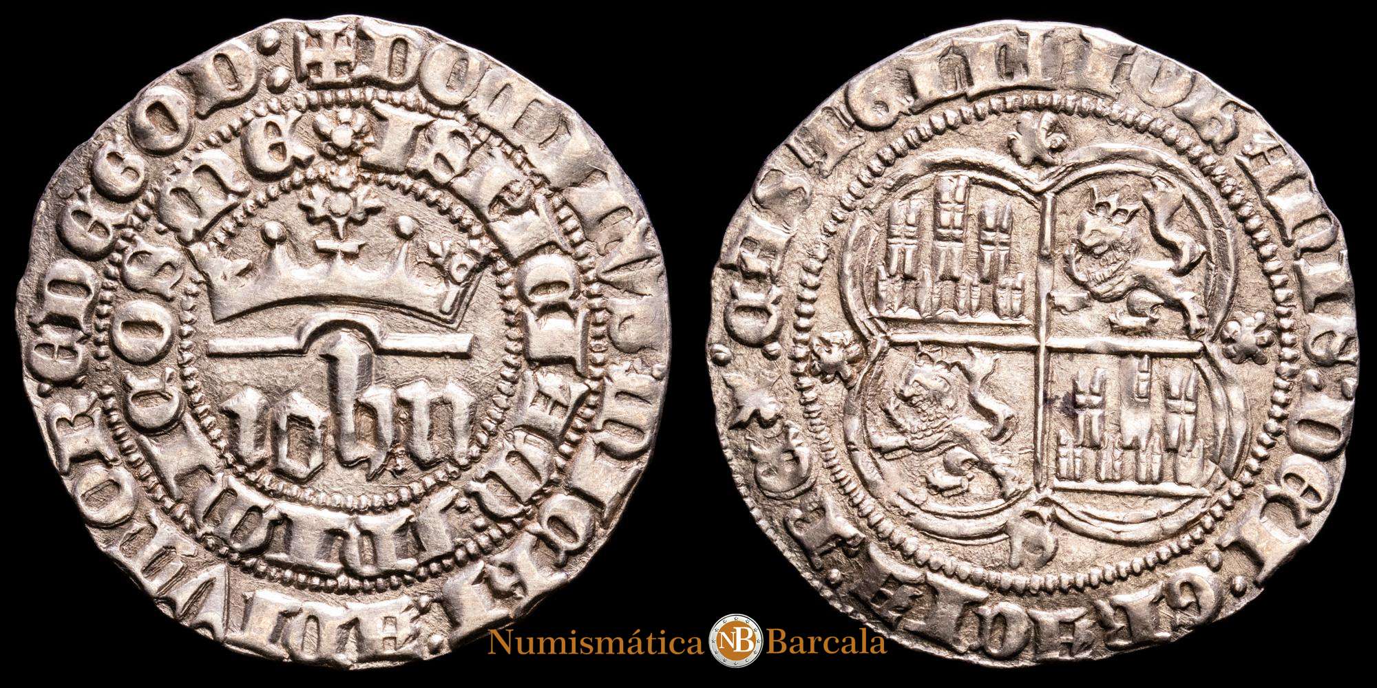 Numismática Barcala > Productos > Reino de Castilla y León. Juan I (1379-1390). 1 real. Sevilla. (Bautista-799, como Juan II). Ag. 3,47 gramos. S bajo el cuartelado y rosetas en los extremos. Bonito ejemplar. EBC-.