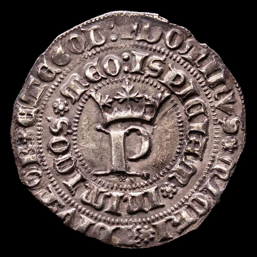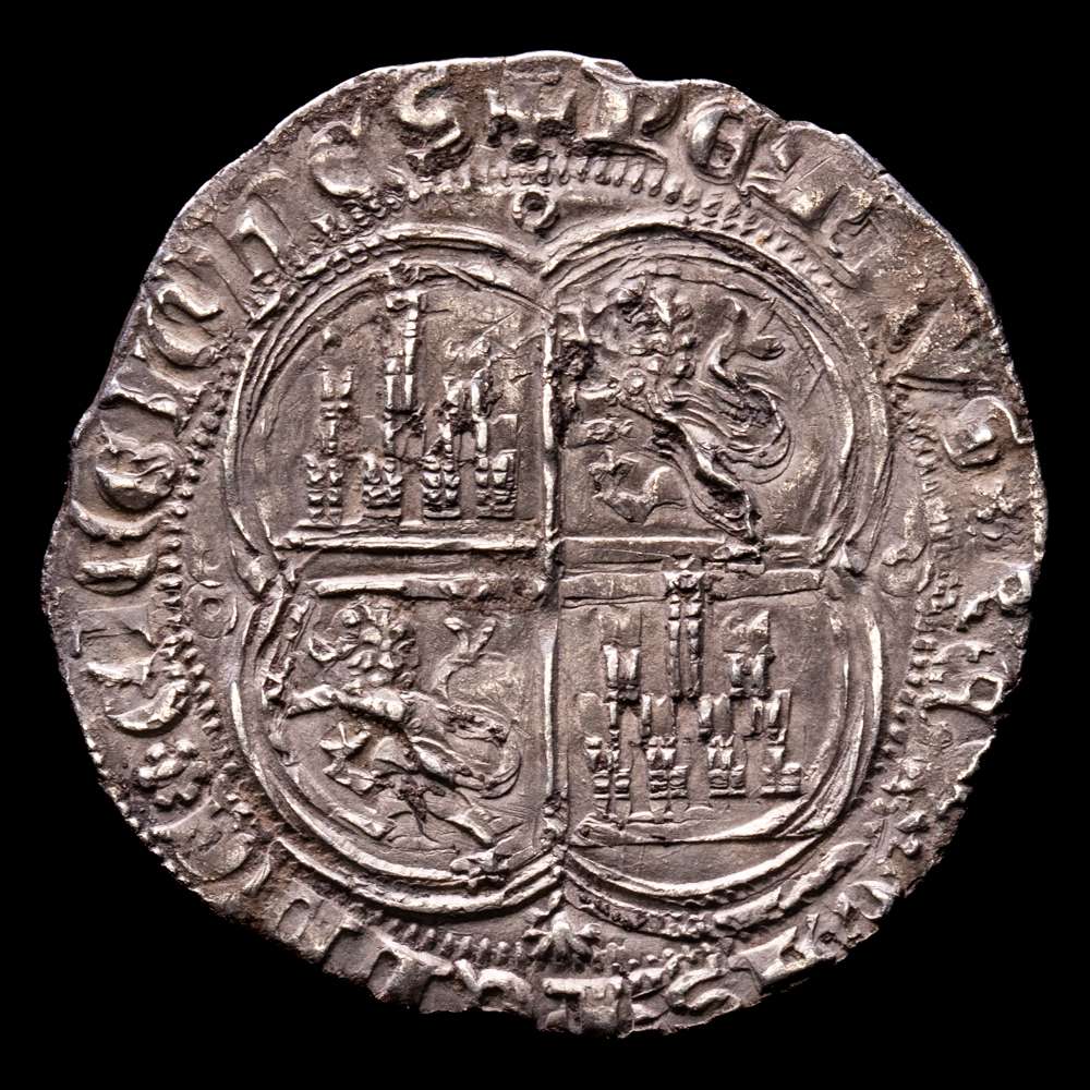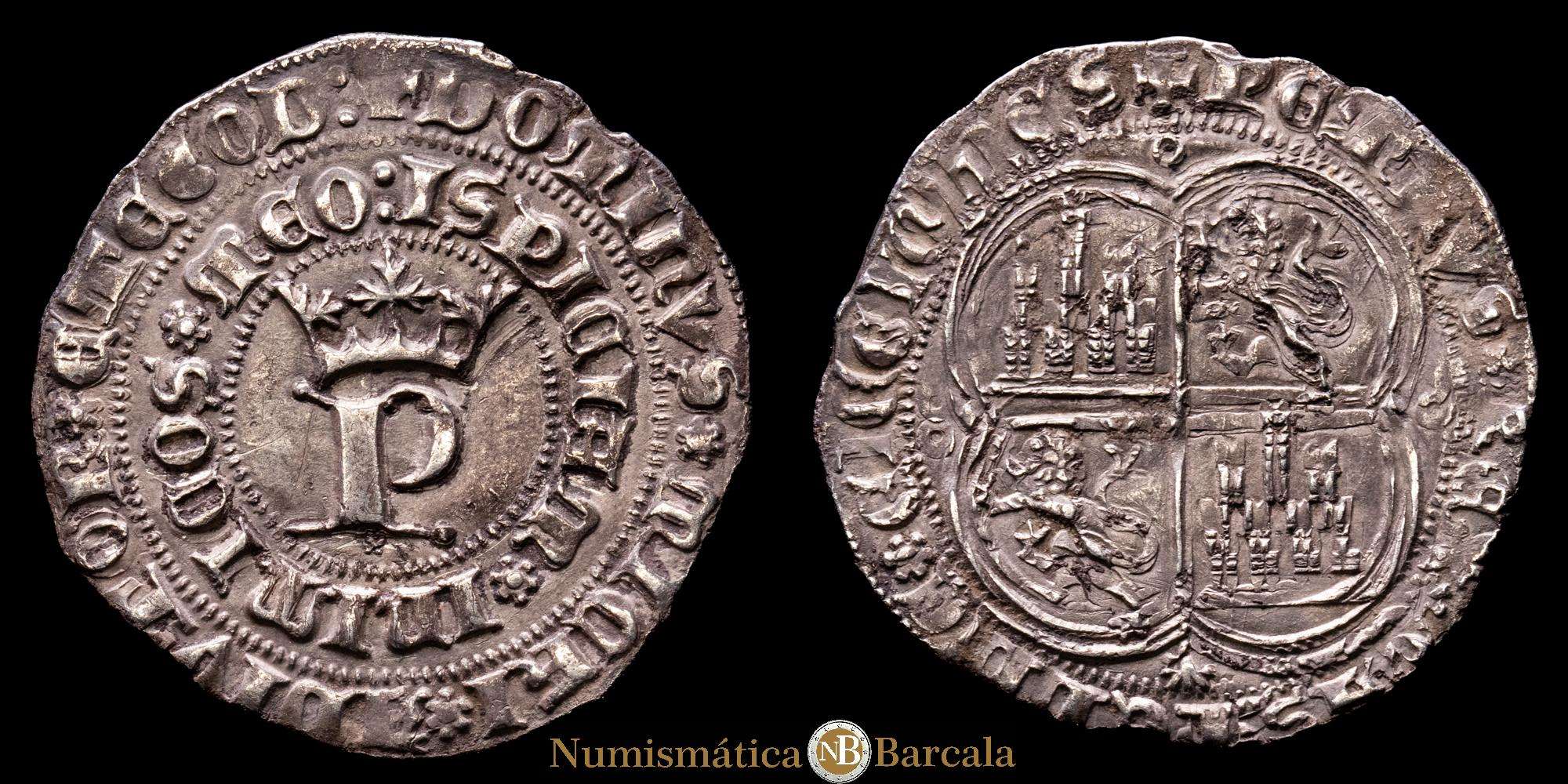 Numismática Barcala > Productos > Reino de Castilla y León. Pedro I (1350-1368). 1 real. Coruña. (Bautista-529.6). Ag. 3,22 g. Aspa bajo la P coronada. Venera en el extremo inferior del eje vertical. Rara. MBC+.