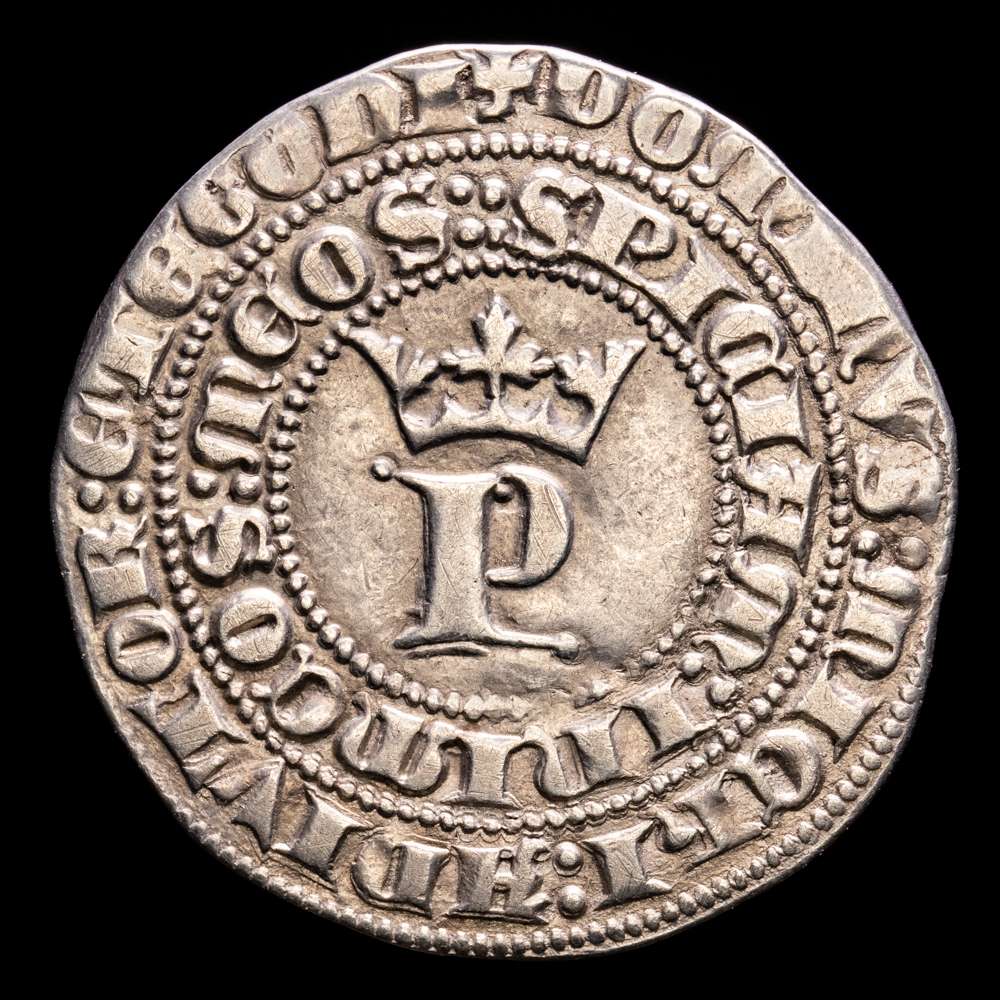 Numismática Barcala > Productos > Reino de Castilla y León. Pedro I (1350-1368). 1 real. Sevilla. (Bautista-528 var.). Ag. 3,38 gramos. S bajo el cuartelado. Punto ePuntos en el interior de la P coronada. MBC+. Escasa.