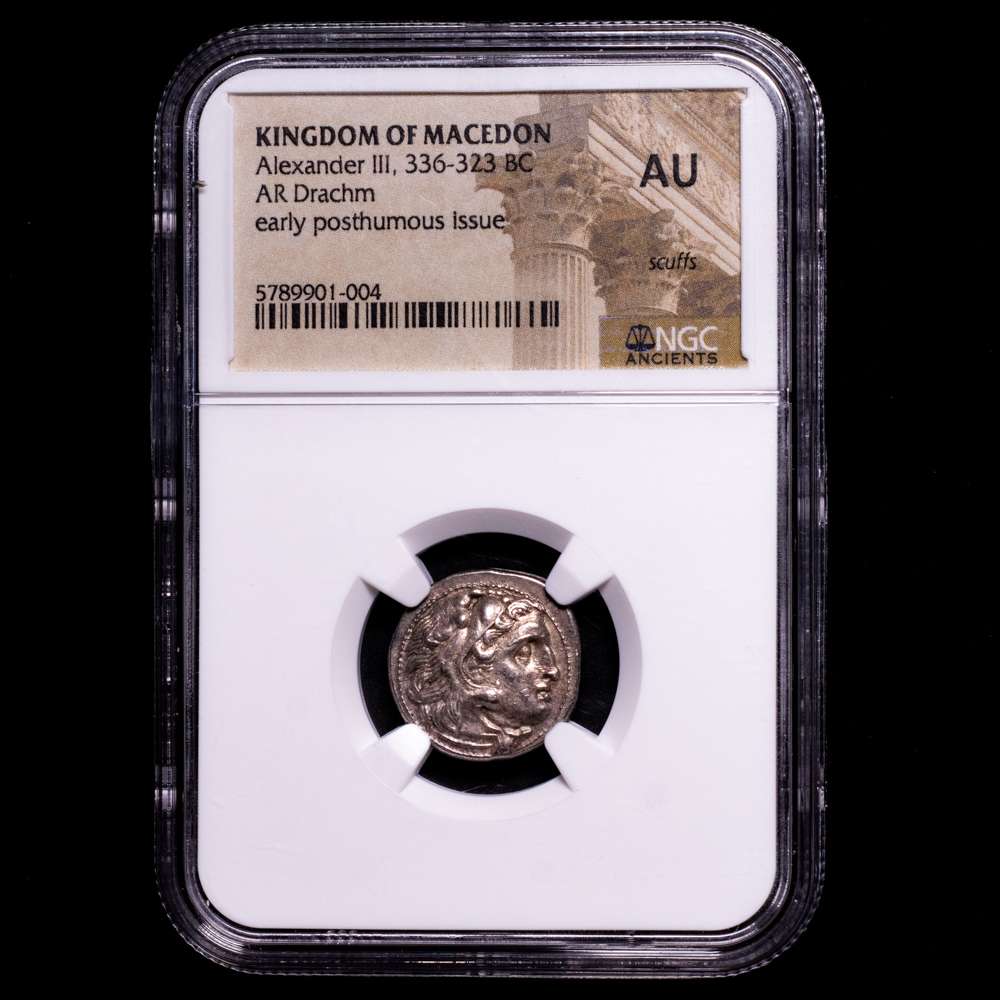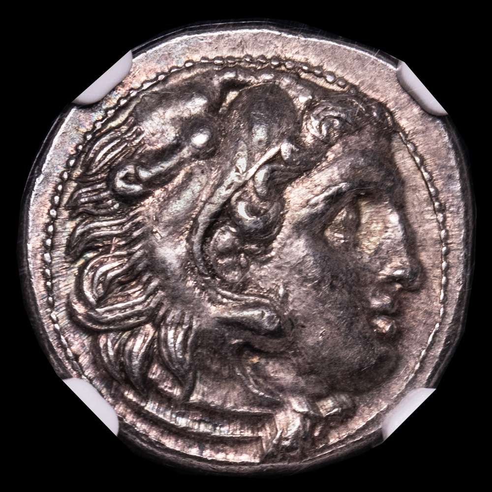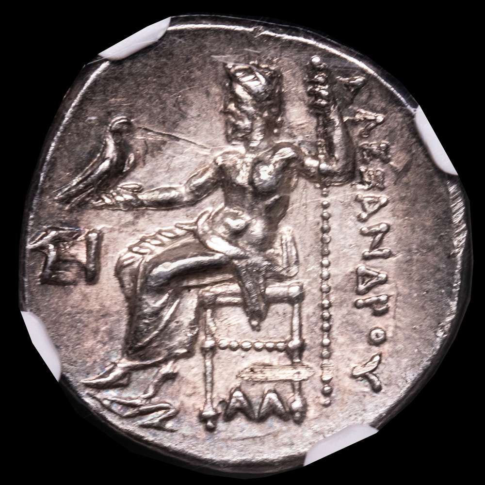 Reino de Macedonia. Alejandro III Magno. Dracma. 324/3 a.C. Sardes. Acuñado bajo Menander. (Price-2555). Anv.: Cabeza de Heracles a la derecha, con tocado de piel de león. Rev.: AΛEΞANΔPOY. Zeus sedente a la izquierda en un trono bajo, con un cetro largo en la mano izquierda y un águila en pie a la derecha con las alas plegadas en la derecha; en el campo izquierdo, una rosa; debajo del trono, monograma de ΛA debajo de la estructura. Ag. Muy bien centrada. Encapsulada por NGC como AU.