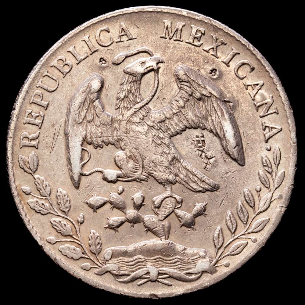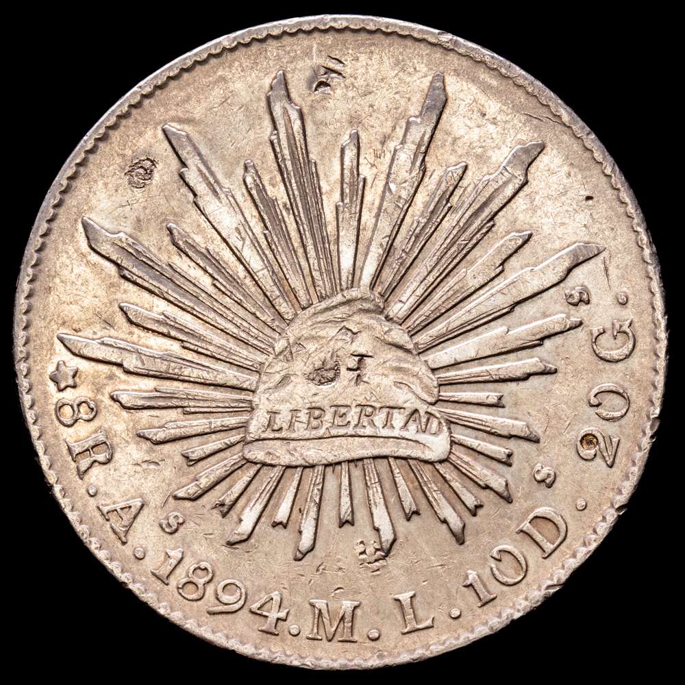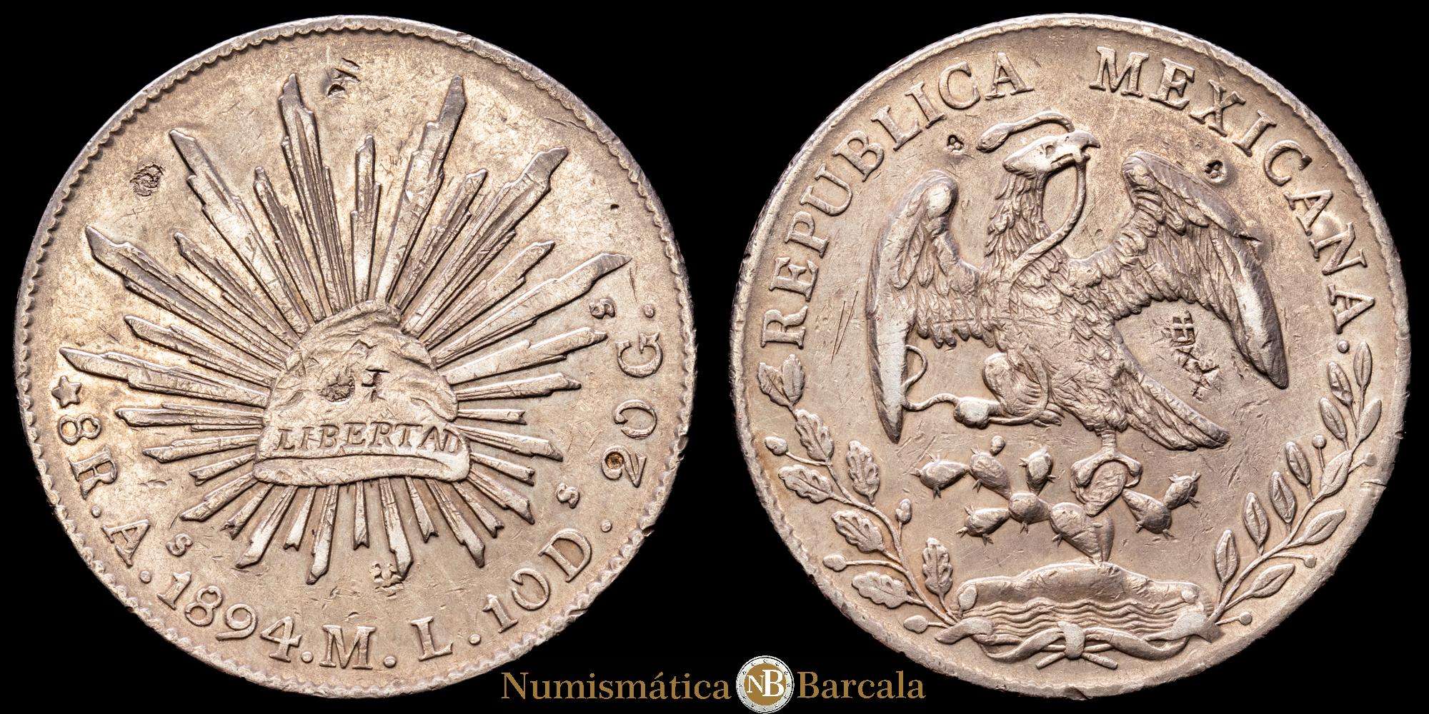 Numismática Barcala > Productos > Repúbilca de México. 8 Reales. (27,24 g.). Álamos. 1894. M·L. (Km-377). Ag. Resellos orientales. VF+.