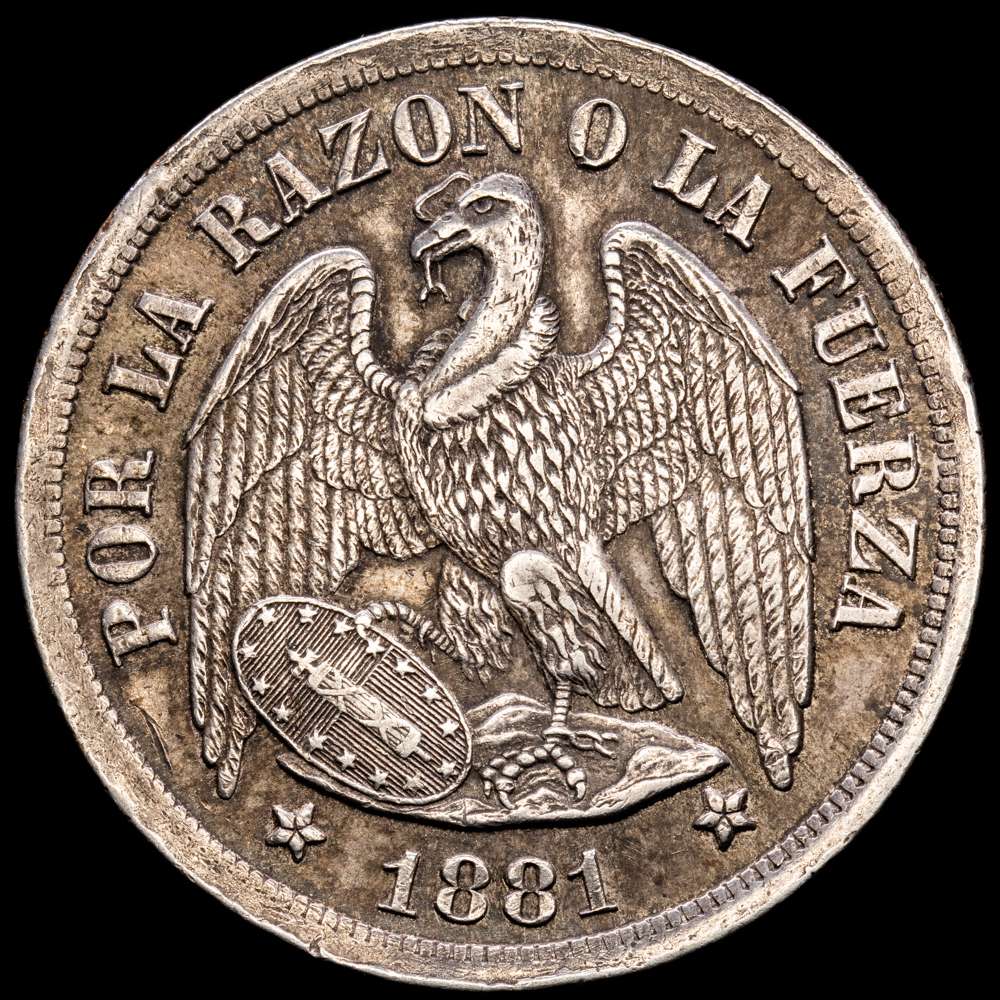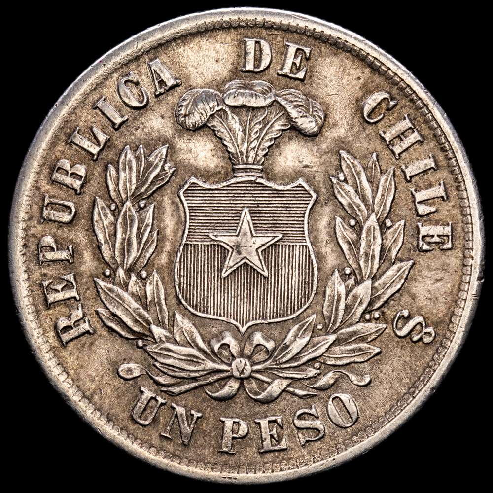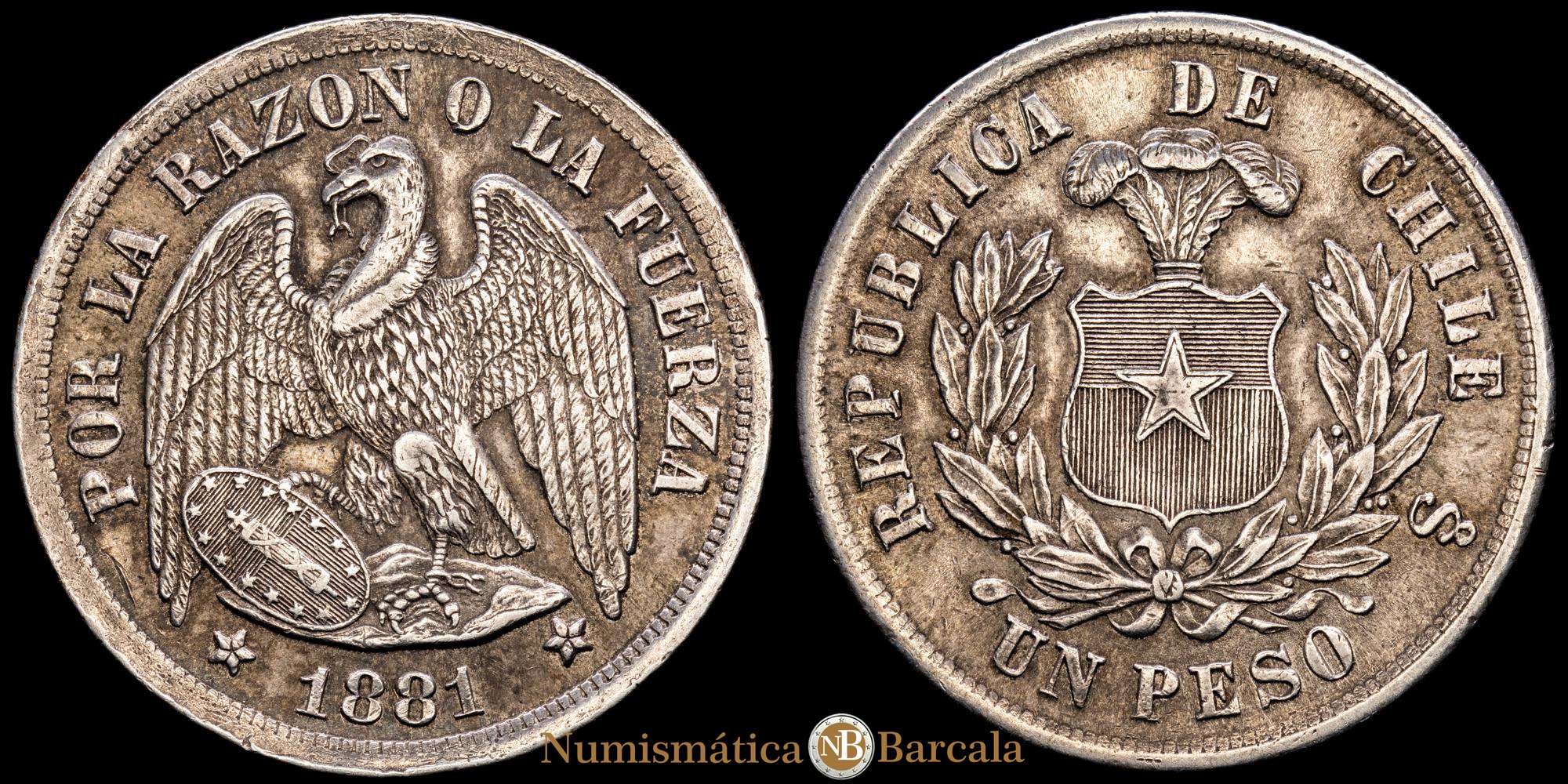 Numismática Barcala > Productos > República de Chile. 1 Peso. (24,86 g.). Casa de la Moneda de Santiago de Chile. Plata (.900). 1881. KM-142. XF.