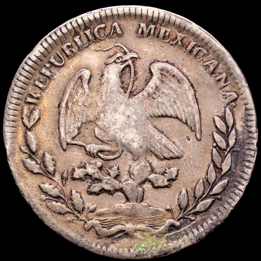 4 Reales, 1827/6 Mo-JM. Casa de Moneda de la Ciudad de México, KM375.6. Una pieza excepcional dentro de la serie, con una codiciada combinación de fecha y marca de ceca, ya que la Casa de Moneda de la Ciudad de México no volvería a acuñar un 4 Reales hasta varias décadas después. Si bien el paso del tiempo ha atenuado los detalles más brillantes, aún se aprecian numerosos detalles en esta variedad con sobrefecha de color intenso. Su escasez es notable, evidenciada por el hecho de que solo se conocen muy pocos ejemplares. 13,21 gramos. VF.