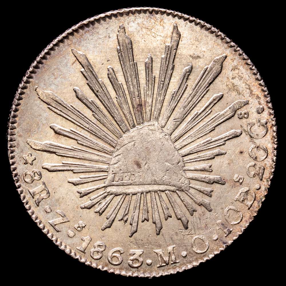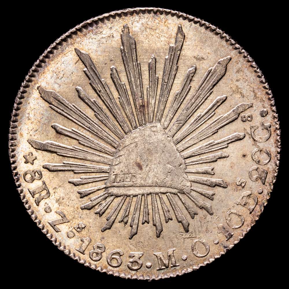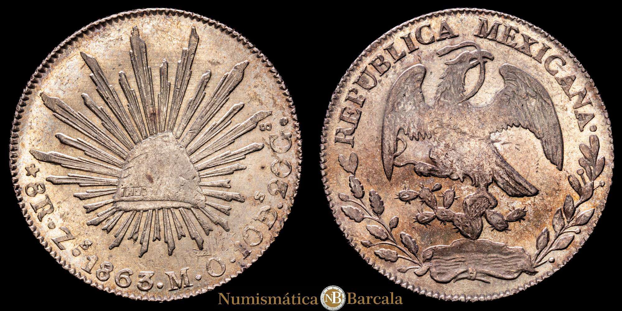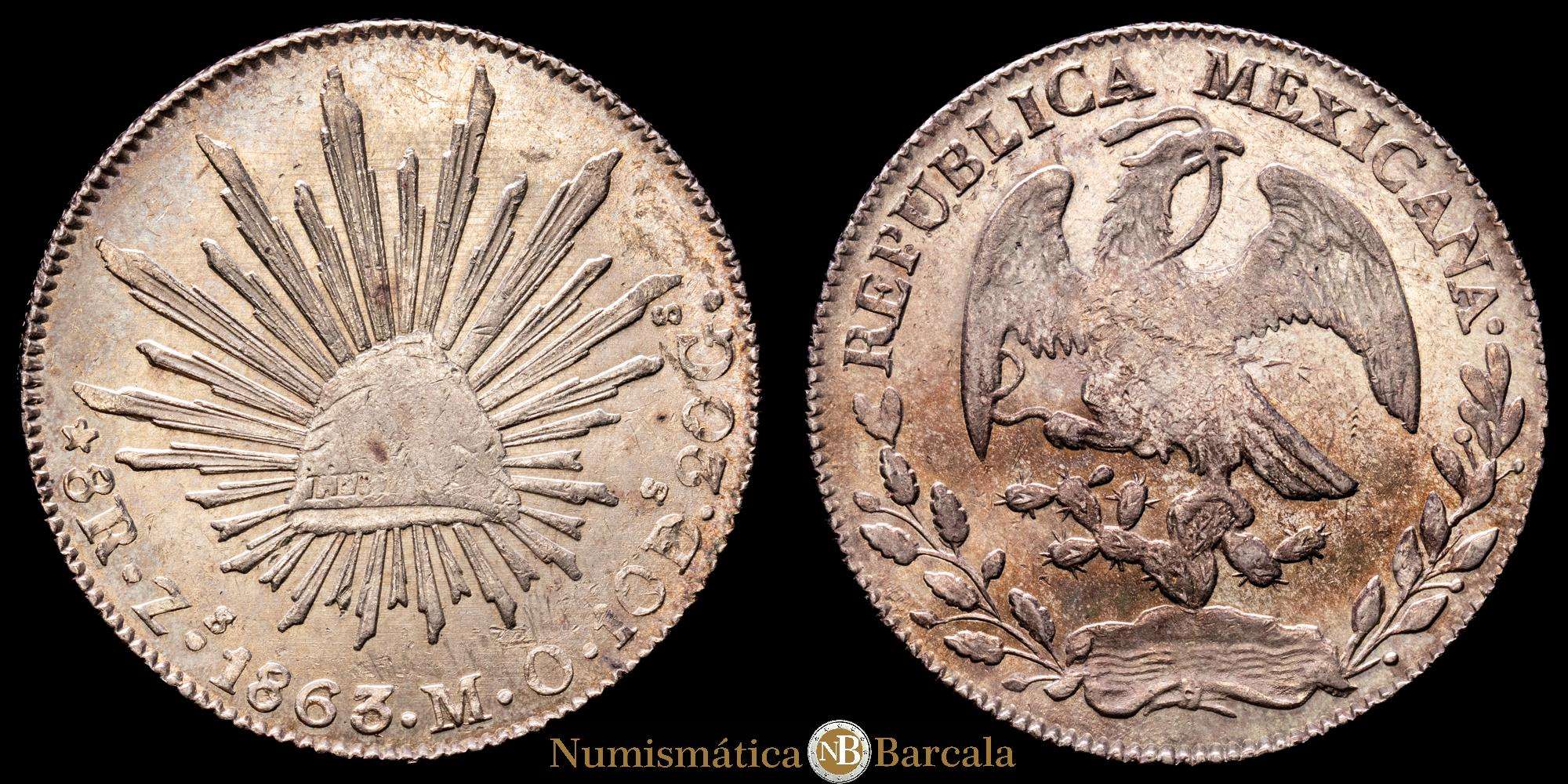 Numismática Barcala > Productos > República de México. 8 Reales. (26,61 g.). Zacatecas. 1863. M·O. (KM. 377.11). Parte de brillo original. AU. Suave pátina.