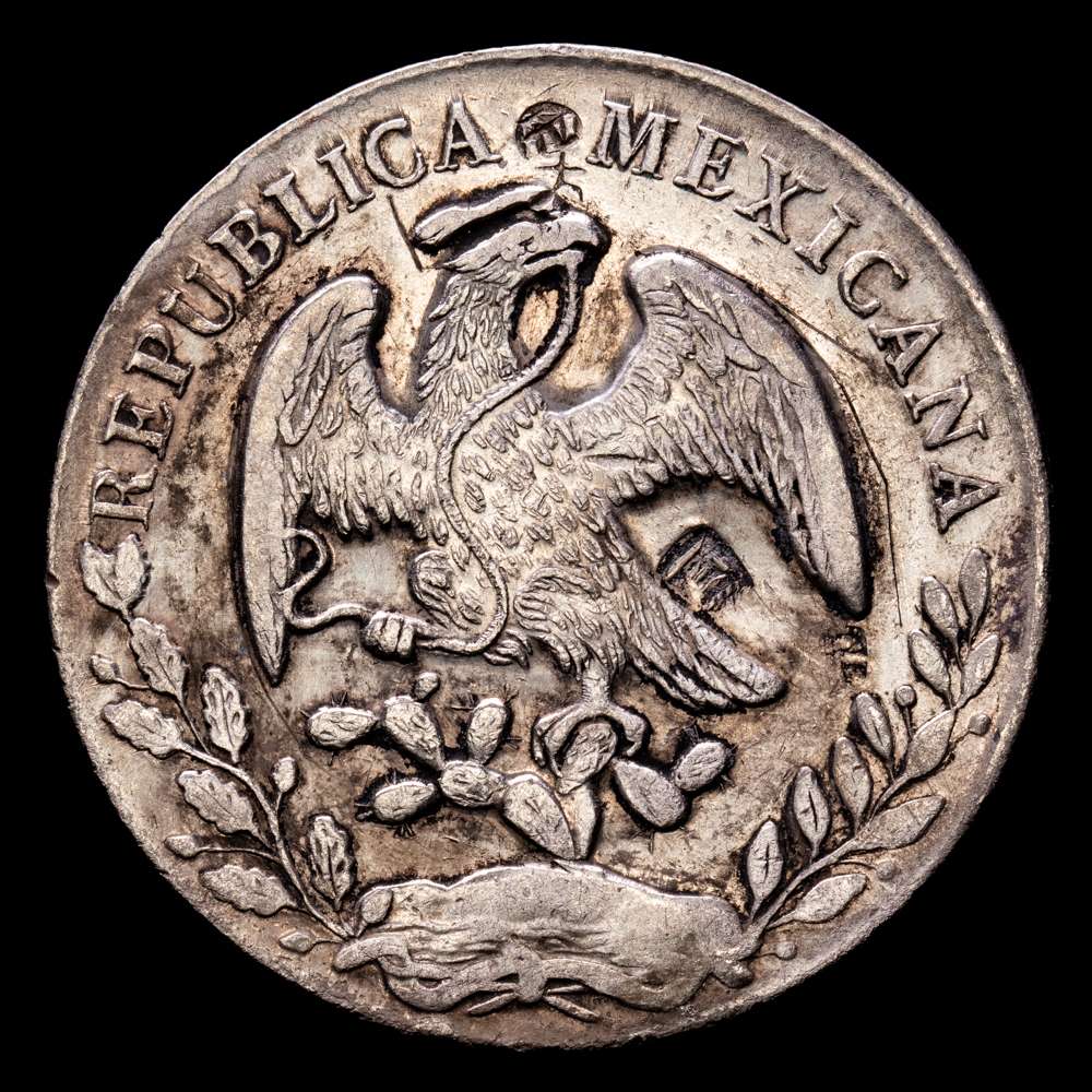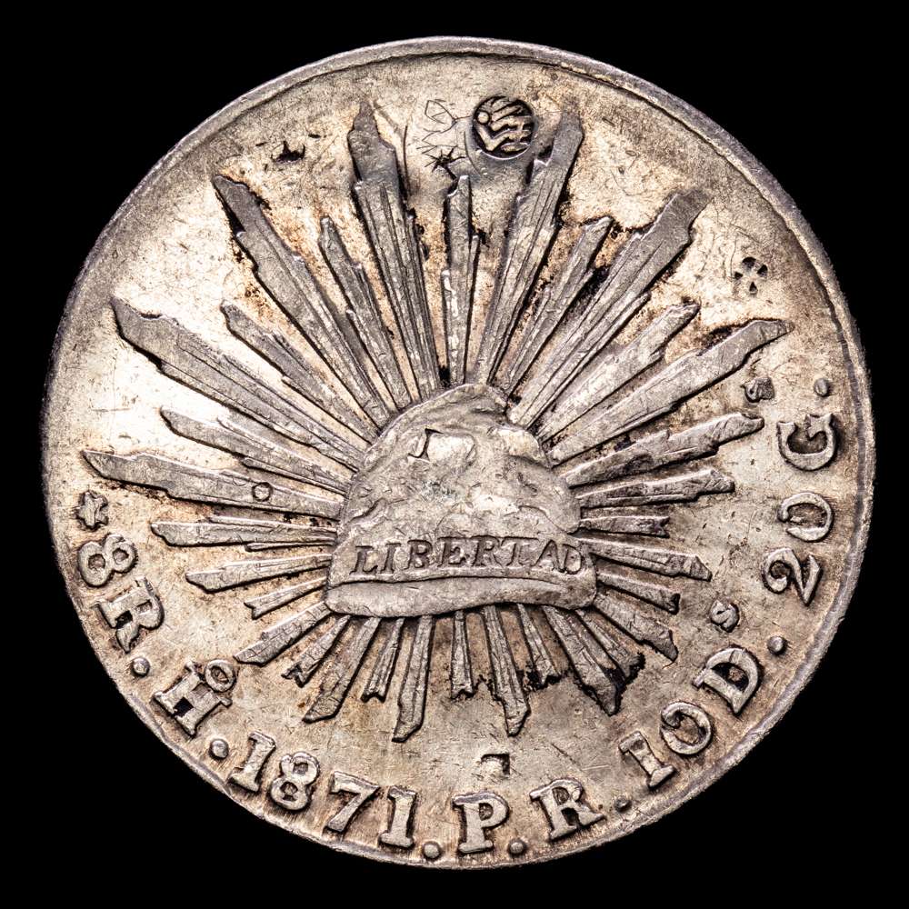Numismática Barcala > Productos > República de México. 8 Reales. (26,77 g.). Hermosillo. 1871. P·R. (KM 377.9). (Chinese Chopmarked: 旦, 珍). VF. Escasa.