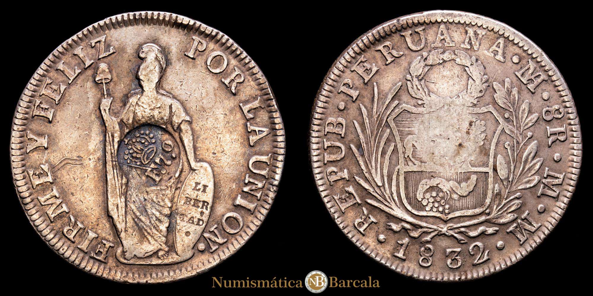 República de Perú. 8 Reales. (27,07 g.). Lima. 1832. Ensayador M·M. KM-142.3. VF+. Resello de Filipinas – F.7.0