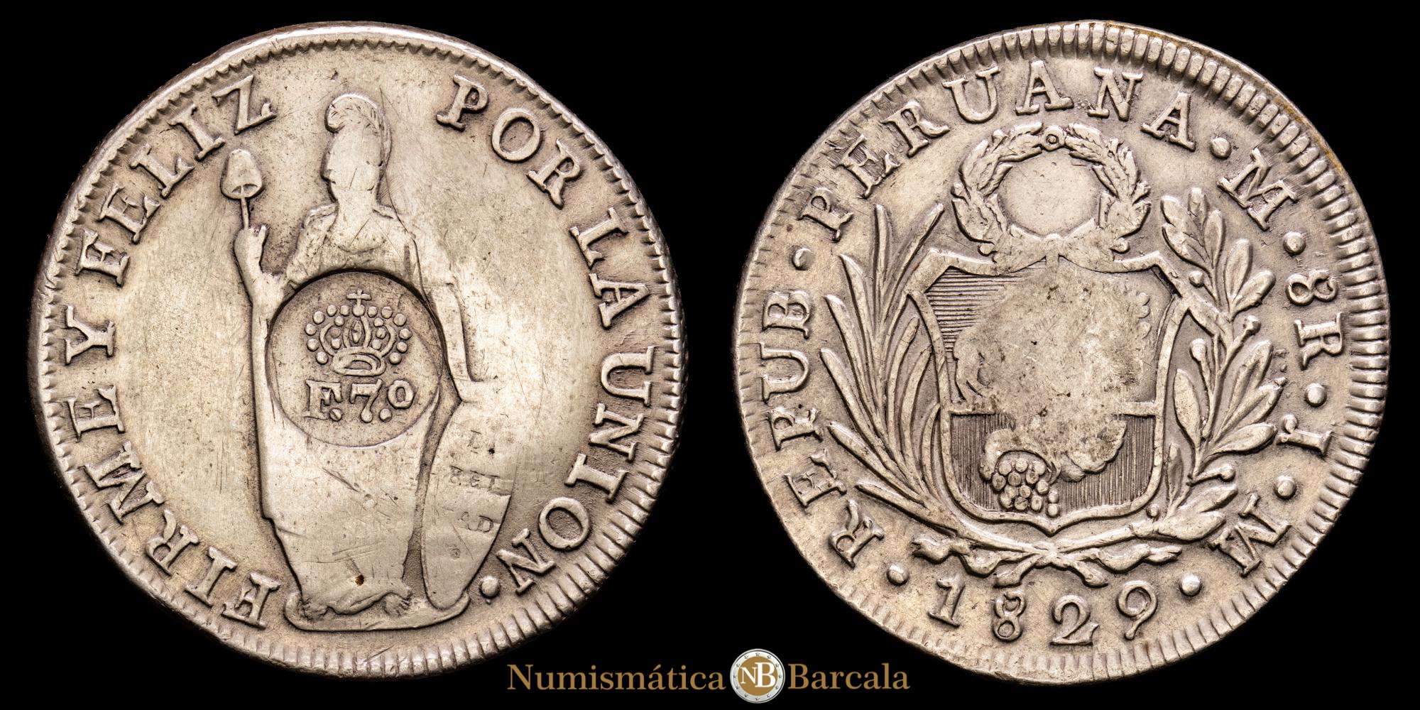 Numismática Barcala > Productos > República de Perú. 8 Reales. (28,39 g.). Lima. 1829. Ensayador J·M. KM-142.3. VF+. Resello de Filipinas – F.7.0
