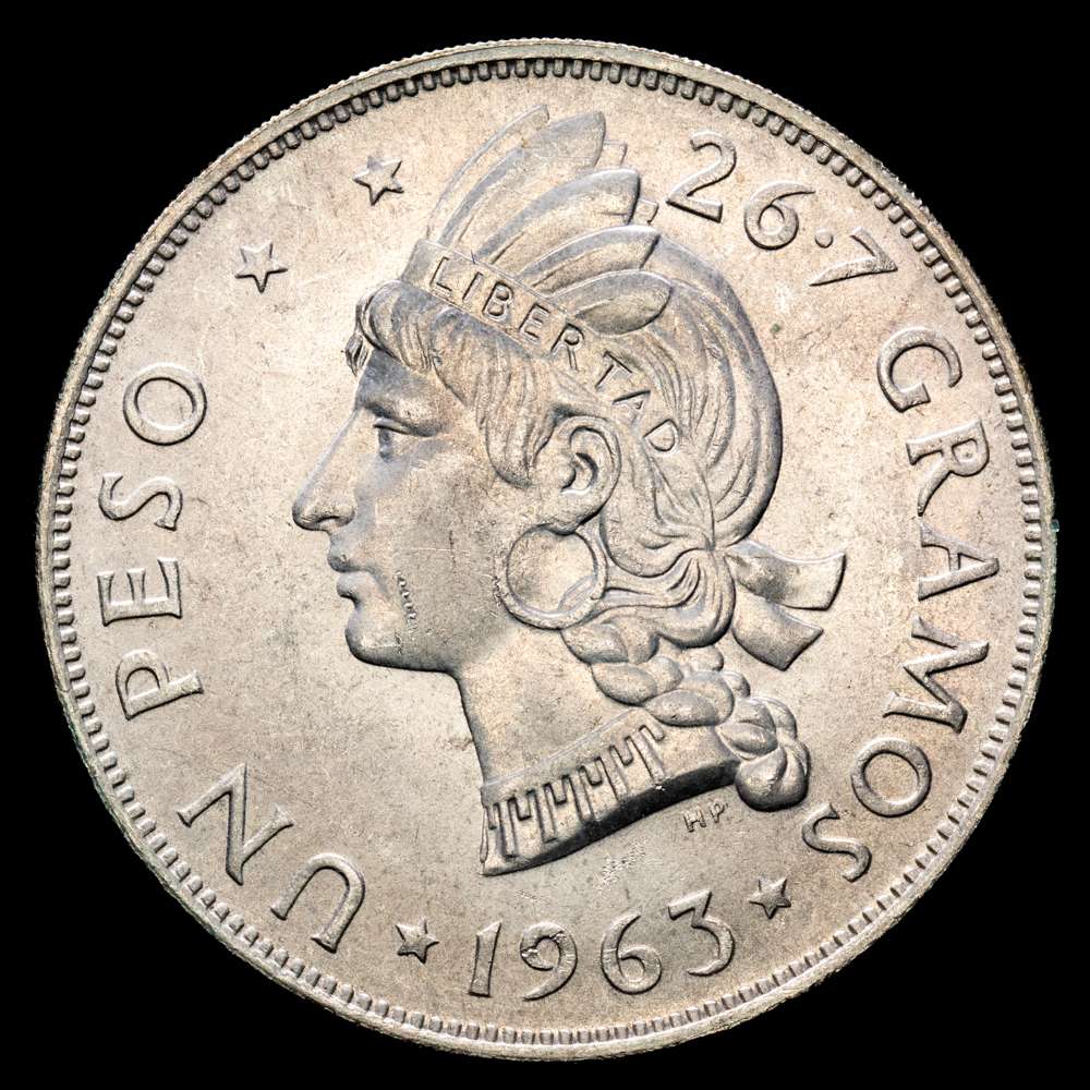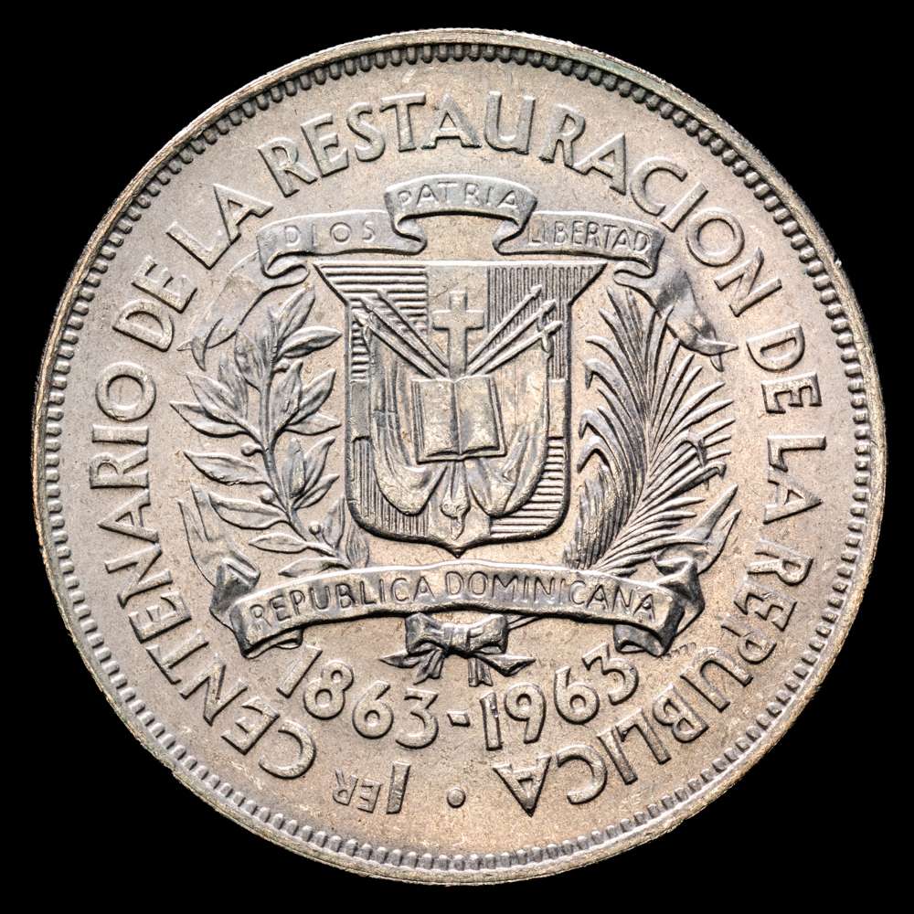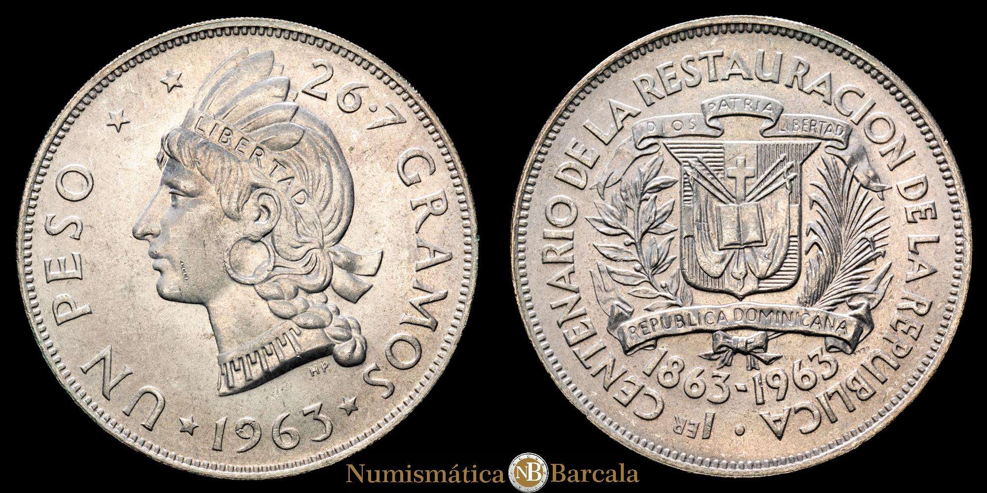 Numismática Barcala > Productos > República Dominicana, 1 Peso,1963. Conmemorativa del centenario de la Restauración de la República. Tower Hill. 26.7g. Plata 650. KM30. AU.