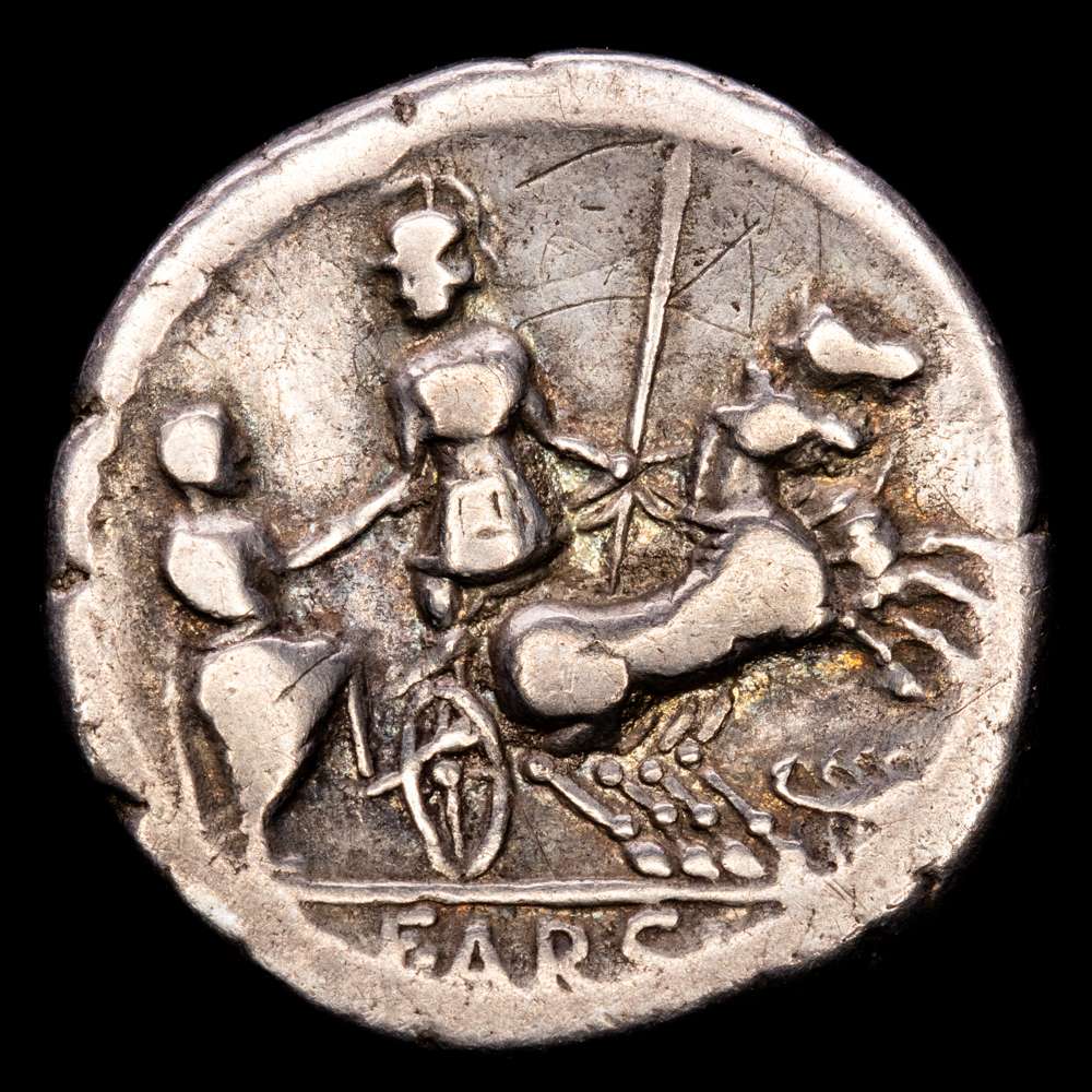 República – L. Farsuleius Mensor. Denario. (3,66 g.). Roma. 75 B.C.. (FFc-707). (Craw-392/1a). (Cal-578). Anv.: Busto diademado de la Libertad a derecha, detrás: gorro frigio y número LXXII ,delante: MENSOR., bajo el mentón: SC Rev.: Guerrero con lanza en biga a derecha, a su lado otro personaje se dispone a montar sobre el cairo, debajo de los caballos: escorpión, en el exergo: L. FARSV(LEI). Ag. 3,66 gramos. Tono suave. MBC.