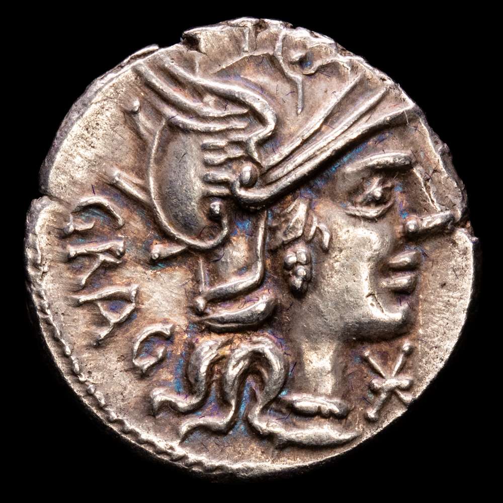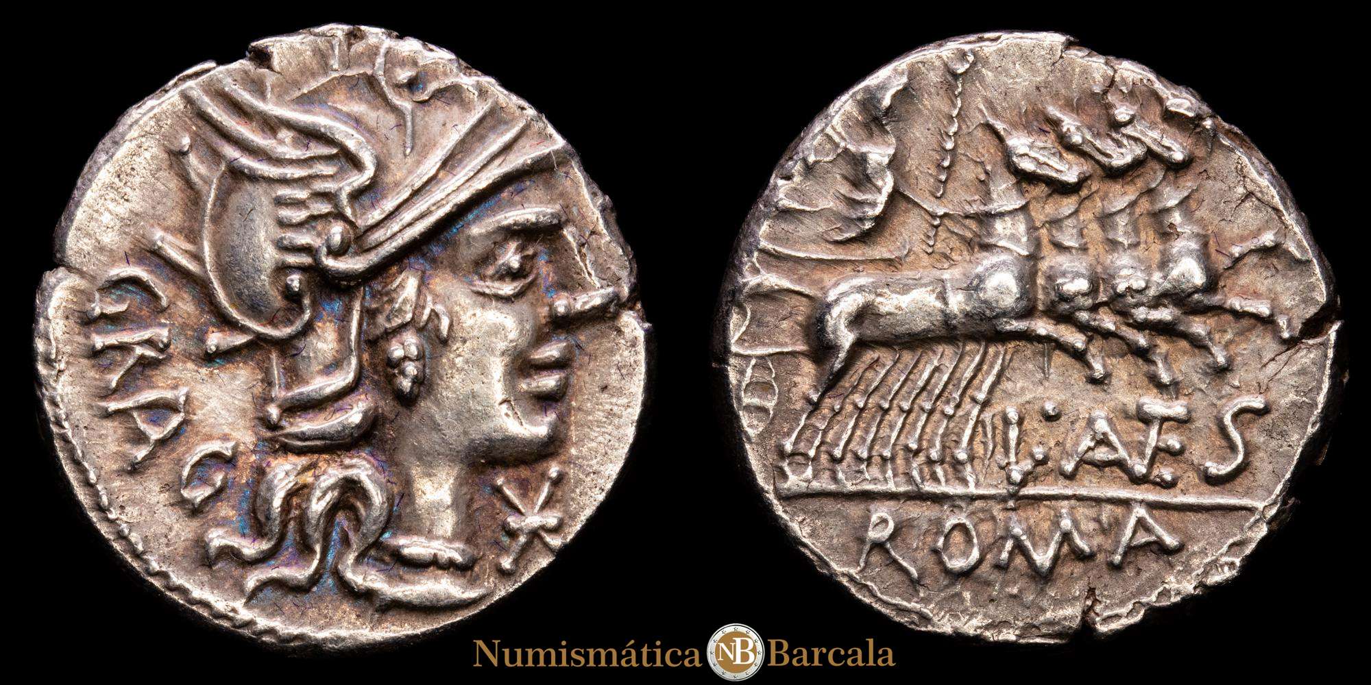 Numismática Barcala > Productos > República Romana ANTESTIA. Denario. Roma (136 aC).(FFc-151). (Craw-238/1). Ag. 3,82 gramos. EBC. Suave pátina irisada.