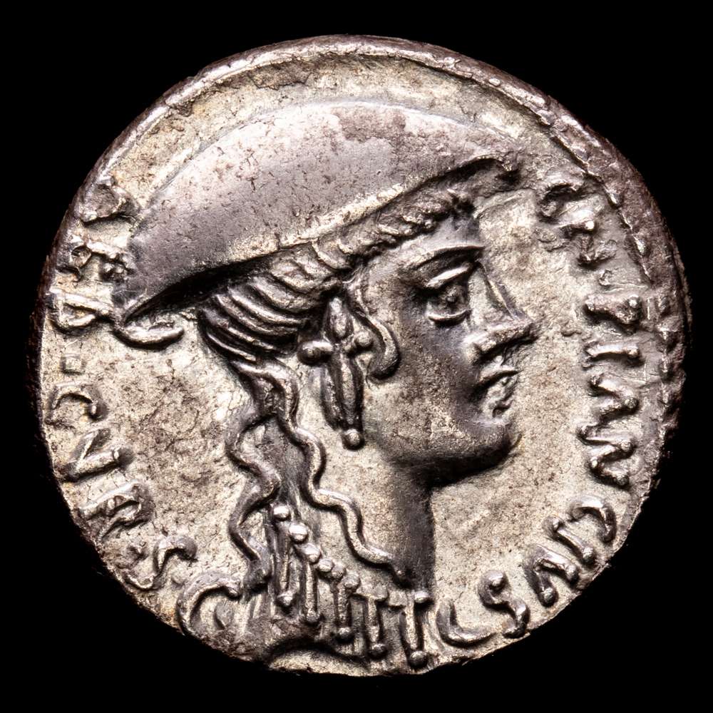 Cn. Plancio, denier AR, 55 av. d. C., Roma. D/ T. fem. a la derecha, portando la causia. Delante, CN·PLANCIVS. Detrás, AED·CVR·S·C. R/ Cabra cretense a la derecha. Detrás, un arco y un carcaj. Cr. 432/1; Sid. 933. 3,77 gramos. EBC.