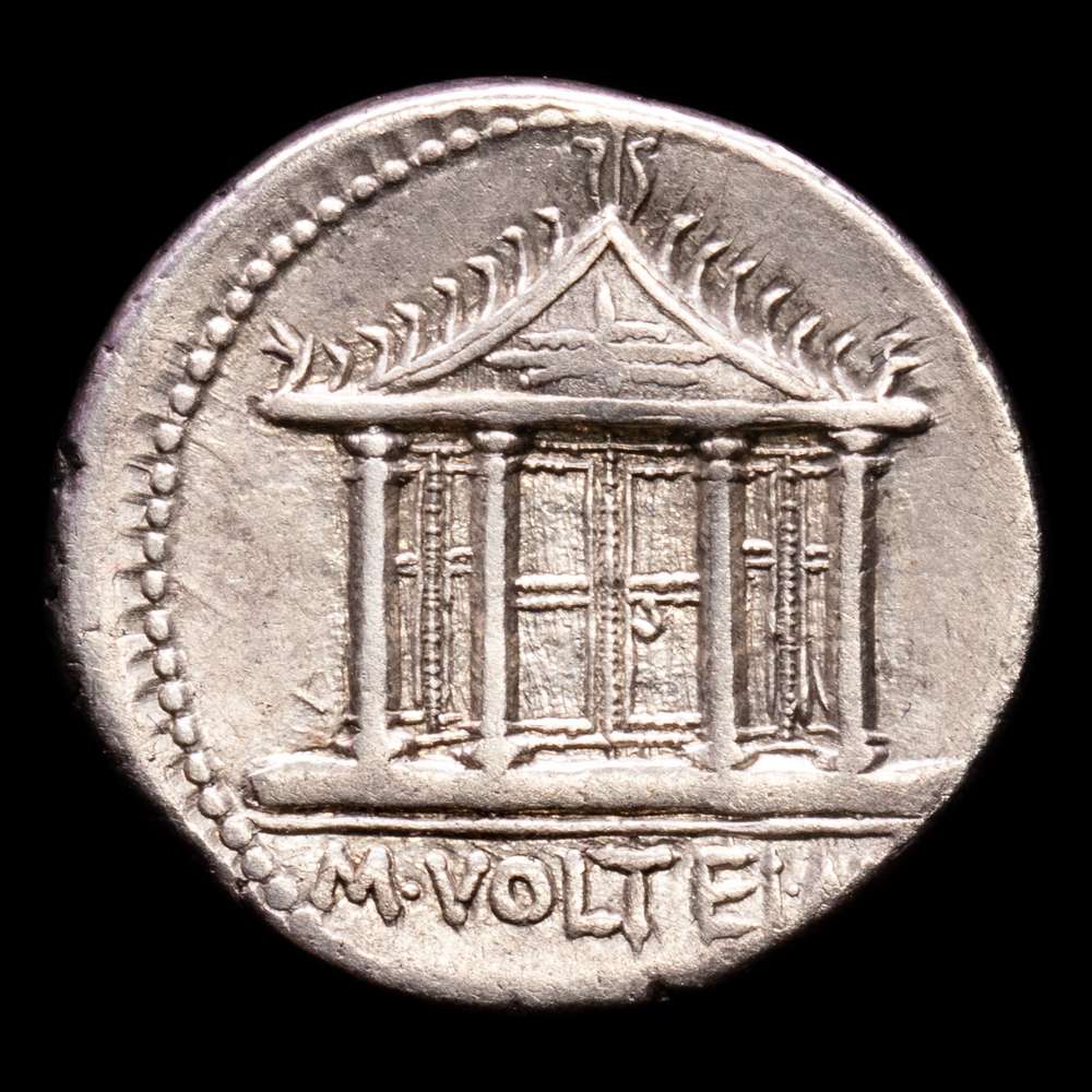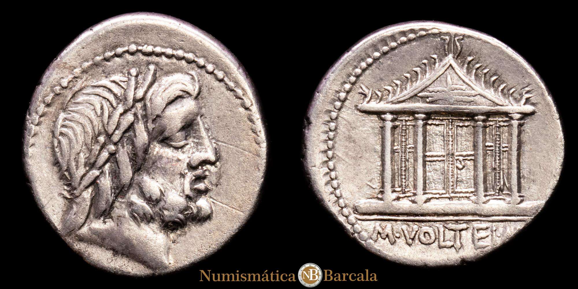 VOLTEIA. Denario. Roma (78 a.C.).(3,61 gr). R/ Templo tetrástilo de Júpiter, en el exergo: M. VOLTEI M. F. Craw-385/1; FFC-1234. SB-1. Dos rayitas en el anv. VF+.