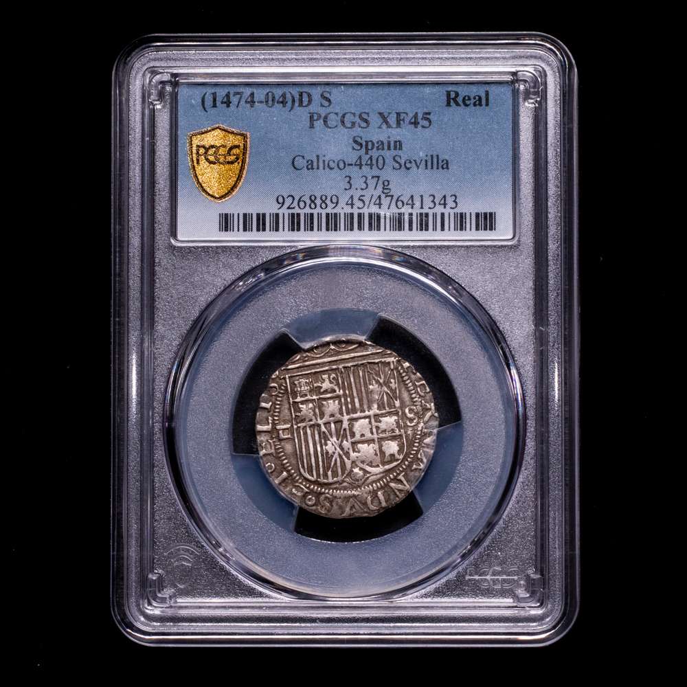 Reyes Católicos (1474-1504). 1real. (Ar. 3,37g/25mm). Ensayador d cuadrado.. Sevilla. (Cal-2019-440). Encapsulada por PCGS como XF 45.