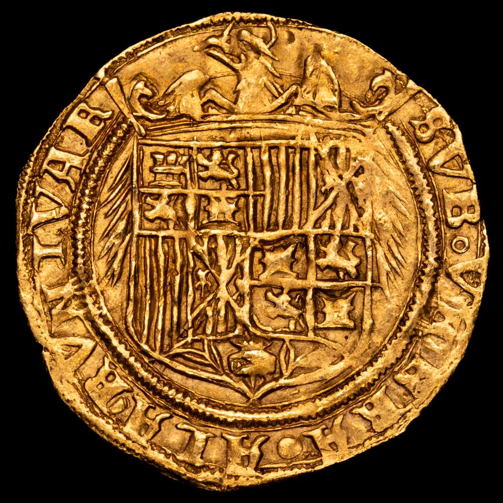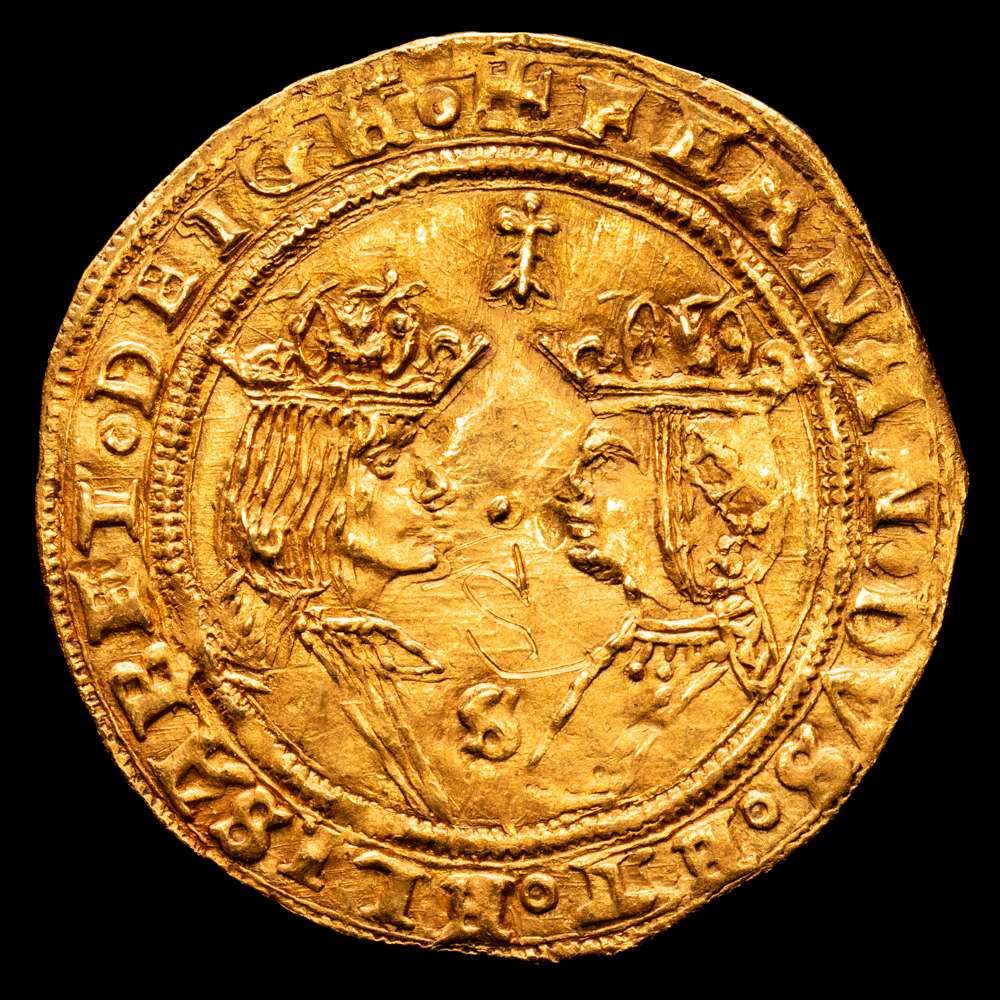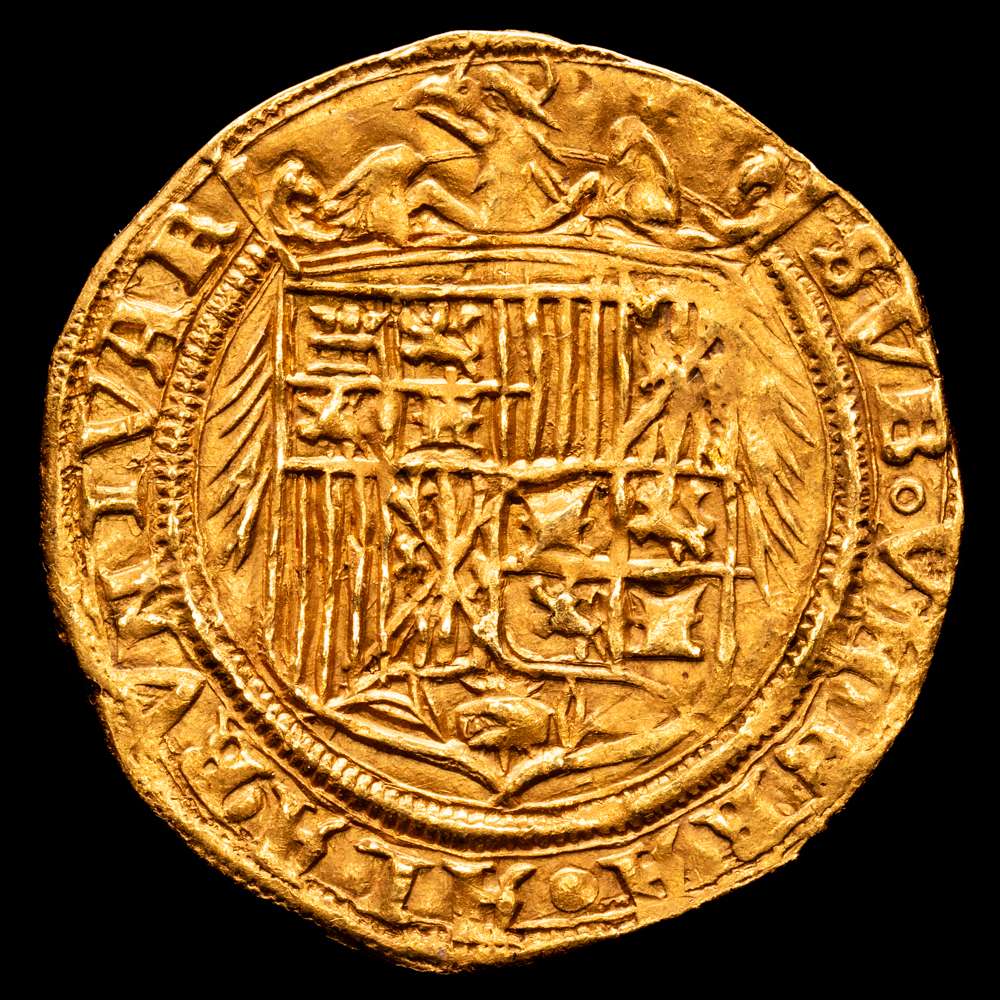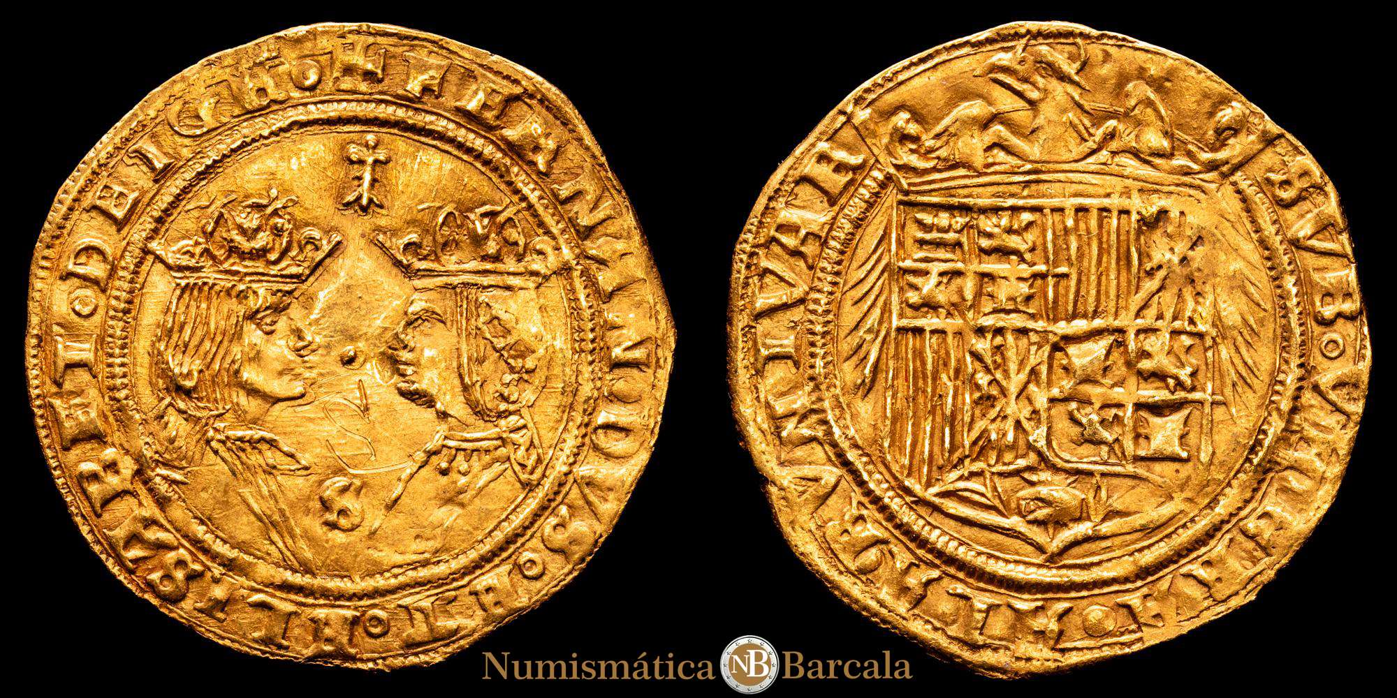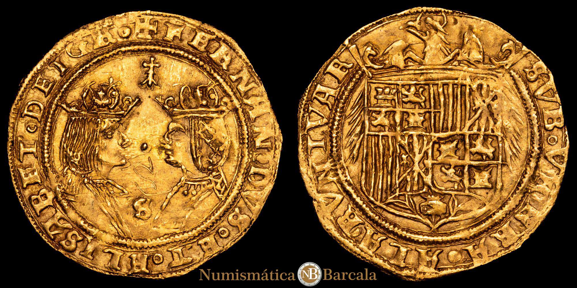 Numismática Barcala > Productos > Reyes Católicos (1474-1504). Doble excelente. Sevilla. (Cal-79). Punto y S entre los bustos, encima armiño. Escudo sin marcas. Au. 6,92 g. Atractiva. Escasa. EBC.