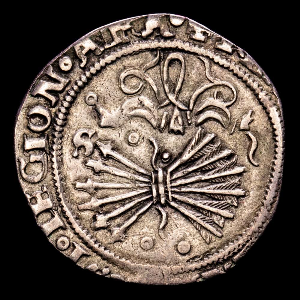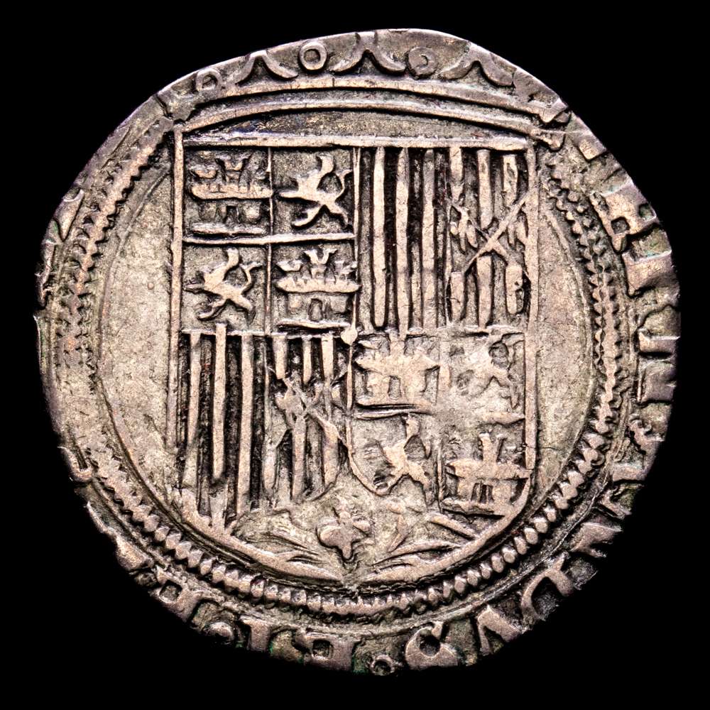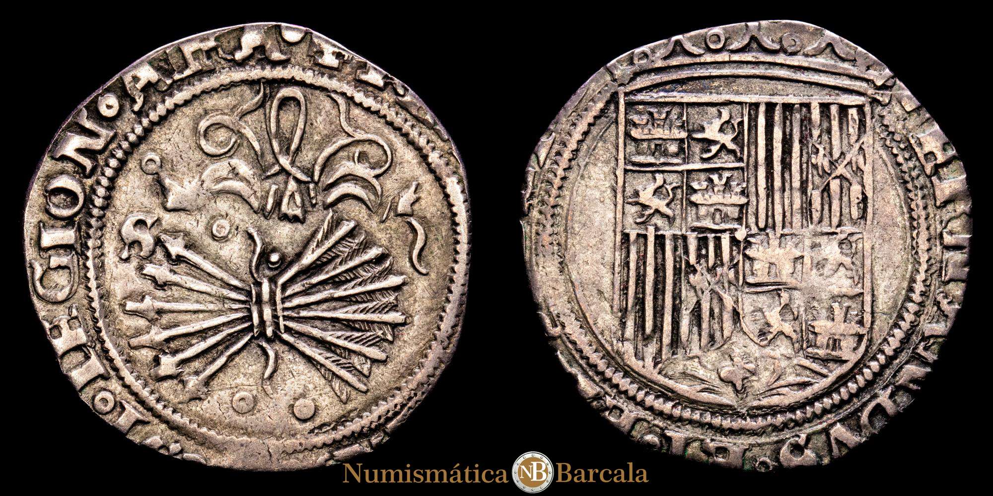Numismática Barcala > Productos > Reyes Católicos. Sevilla. 1 Real. Cuatro anillos en reverso. Cy2723 variante por 6 flechas en el haz. (2,25 gramos). MBC+.