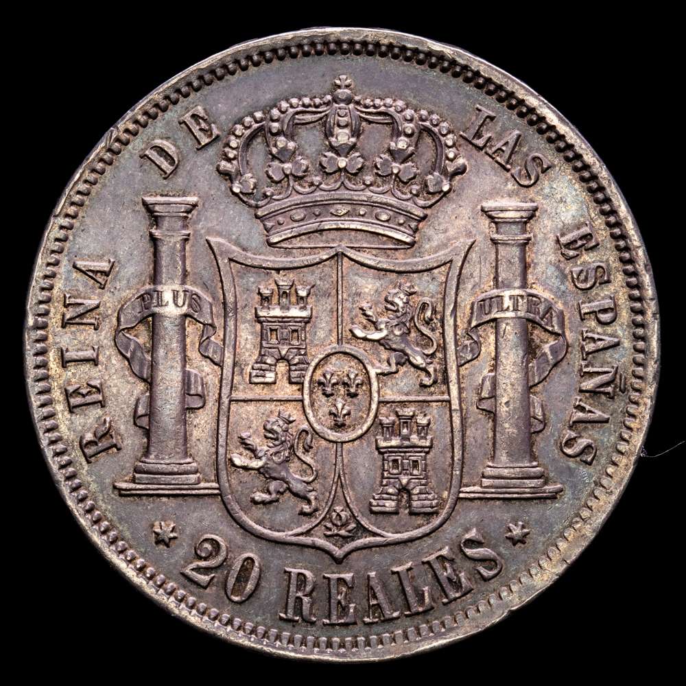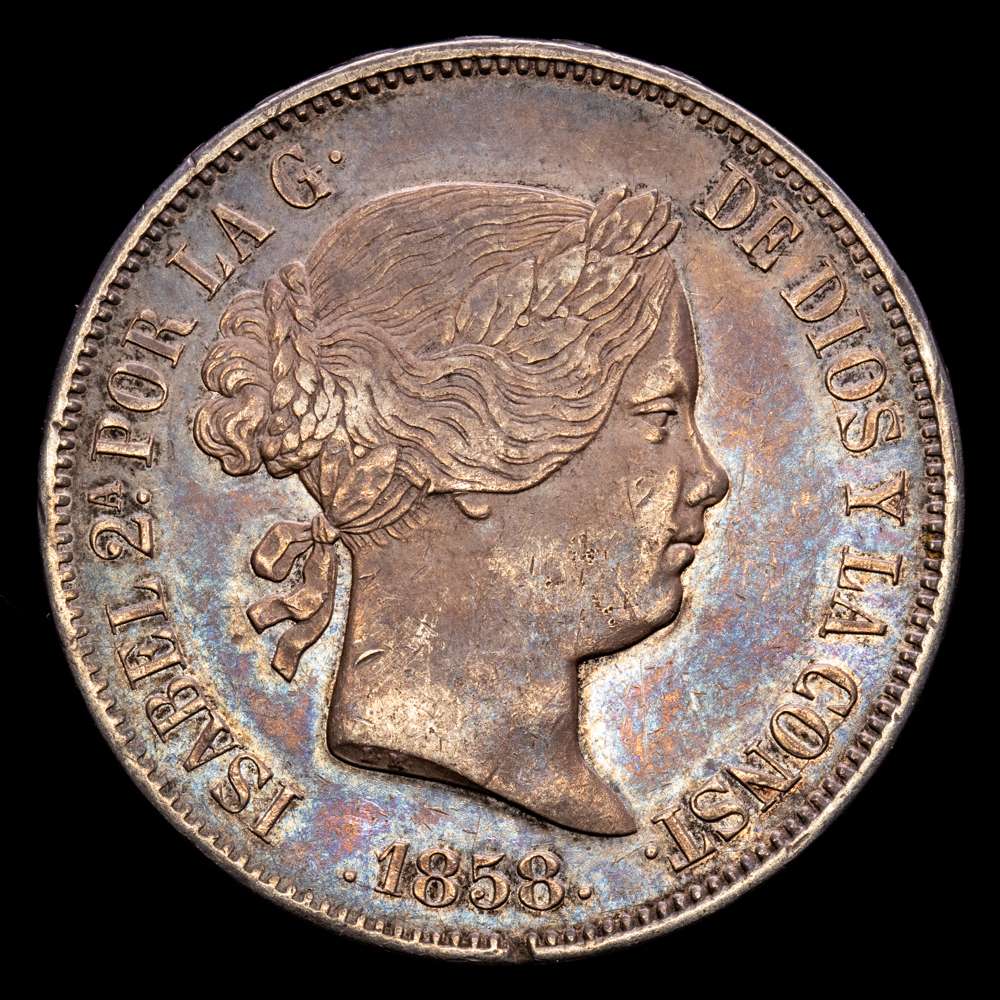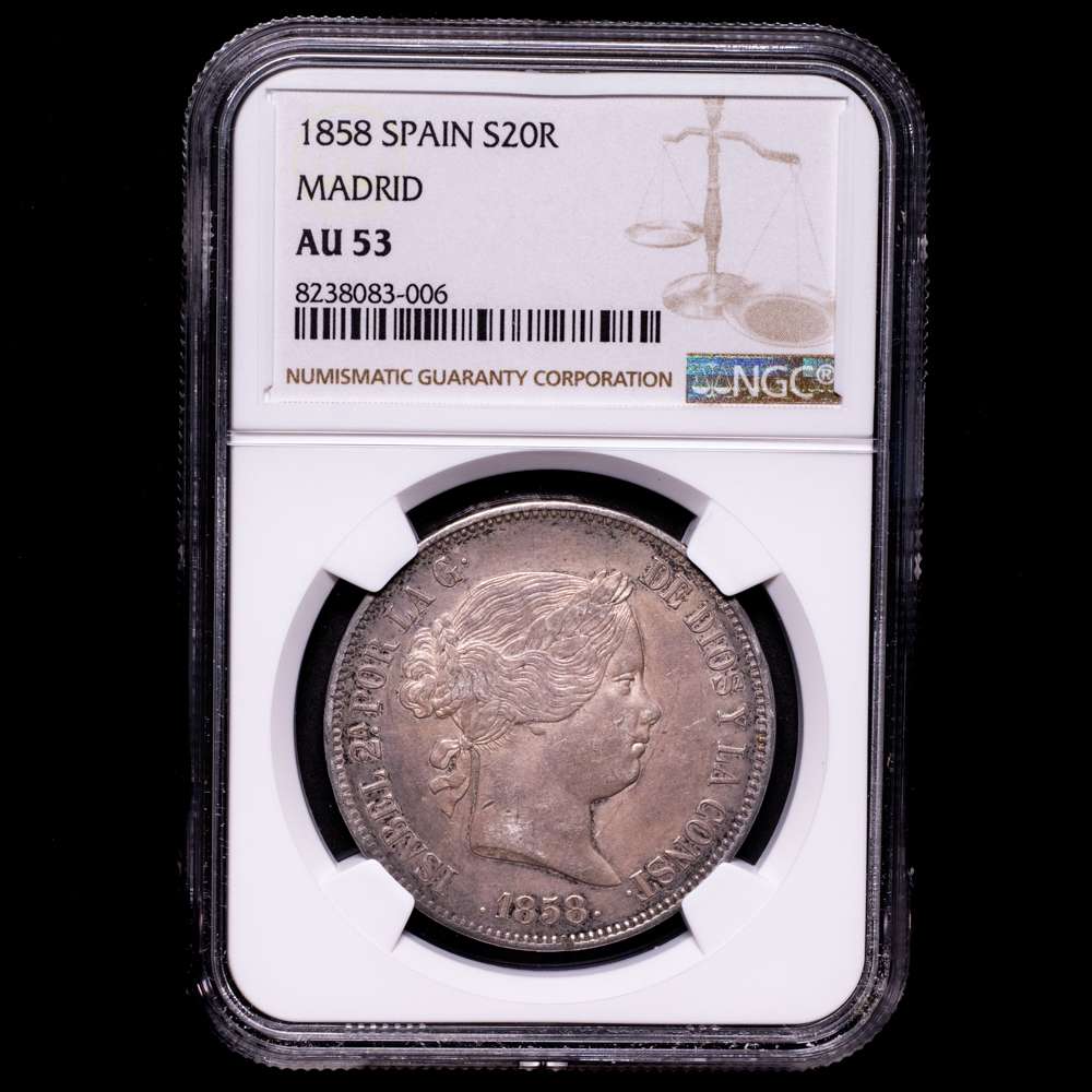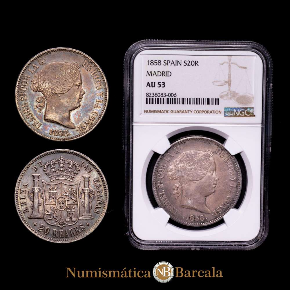 sabel II (1833-1868). 20 reales. 1858. Madrid. (Cal-615). Ag. Golpecitos. Pátina. 25,93 gramos. Encapsulada por NGC como AU-53.