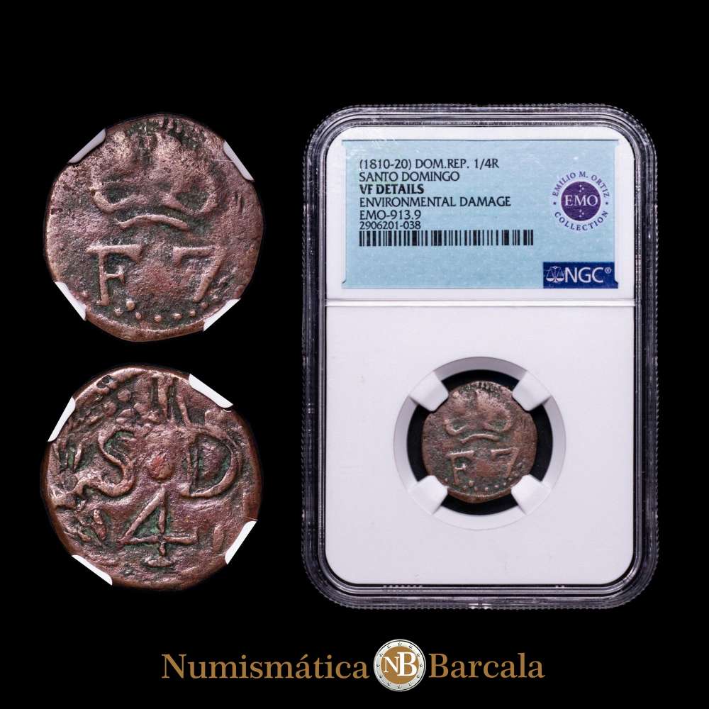 Numismática Barcala > Productos > SANTO DOMINGO. Santo Domingo, Venezuela. 1/4 Real, ND (ca. 1813-20). Fernando VII. Encapsulado por NGC como VF. Detalles: Daños Ambientales. Un ejemplar bastante atractivo en general.