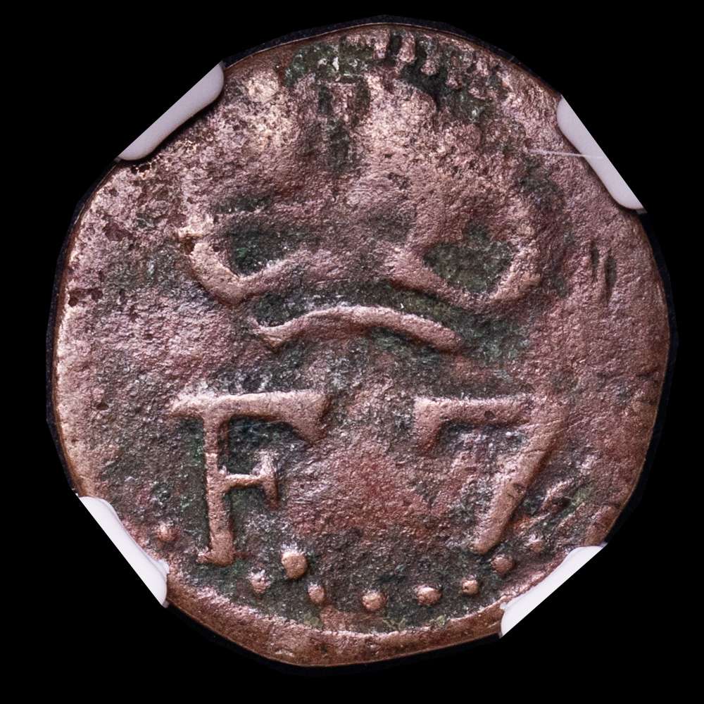 EMO-913.9 (Moneda de plancha); KM-2; Cal-120. Tipo 1 con “SD” como denominación divisoria. Variedad sin punto después del “7”. Sobreacuñada en un Real de Maracaibo (KM-3). Acuñada en un flan compacto, con las perlas del 1/2 Real de Maracaibo (KM-3) sobre el que se acuñó esta moneda visibles bajo el monograma “F7”. Un ejemplar bastante atractivo en general.