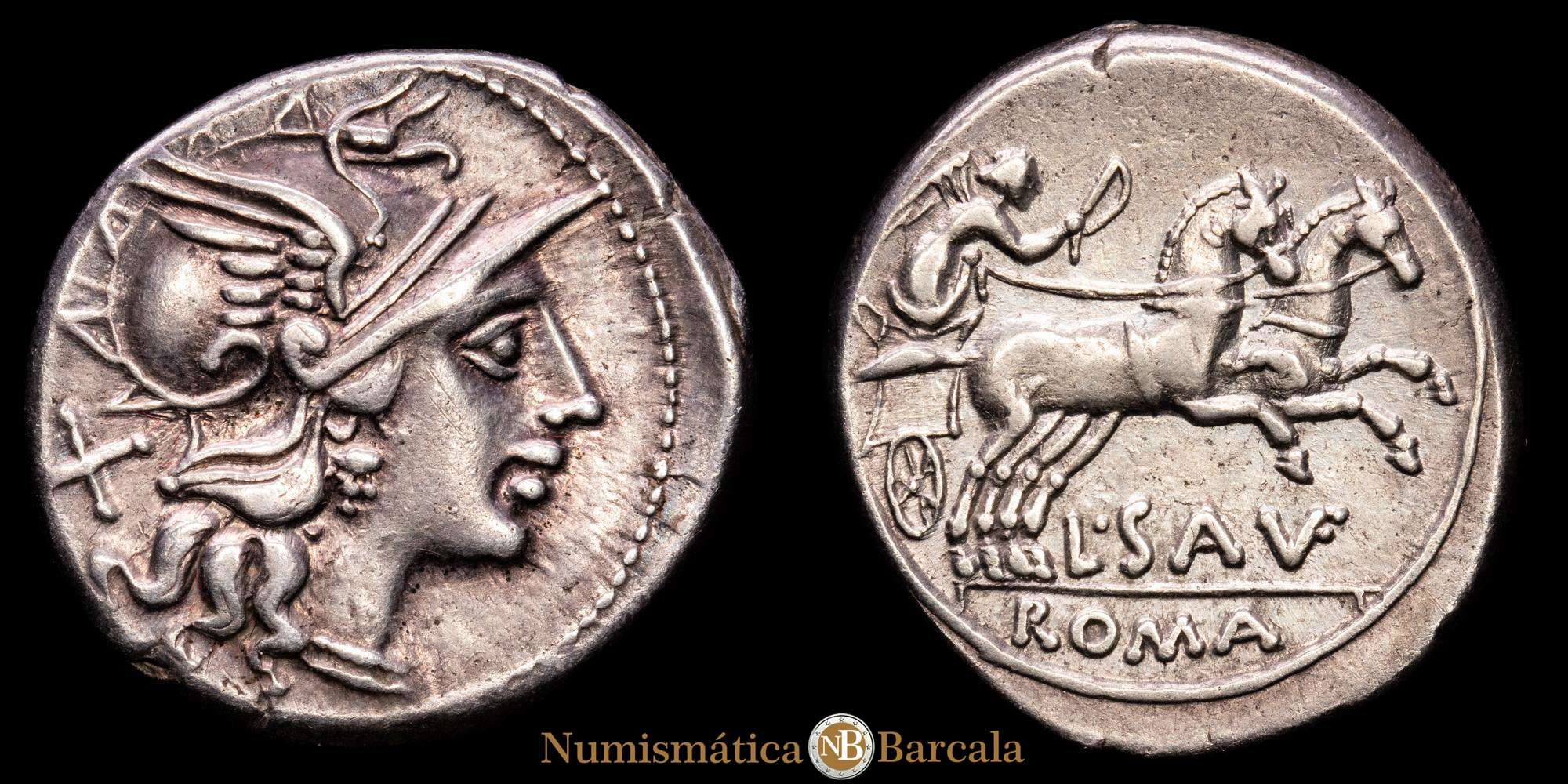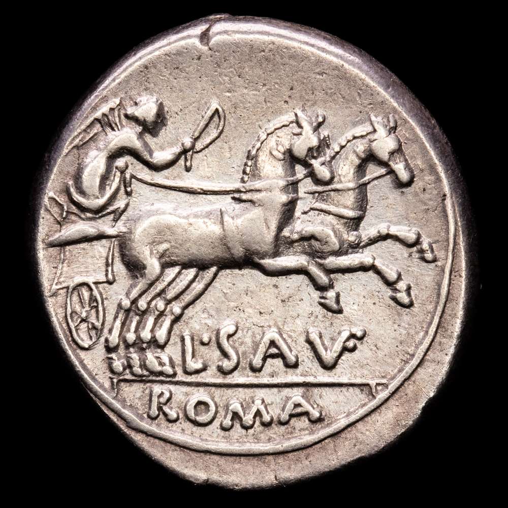 Saufeia. L. Saufeius. Denario. 152 a.C. Roma. (Ffc-1099). (Craw-204/1). (Cal-1245). Anv.: Cabeza de Roma a derecha, detrás: X. Rev.: Victoria con látigo en biga a derecha, debajo: L. SAVF., (VF entrelazadas), en el exergo: ROMA. Ag. 4,15 g. Atractiva. EBC-/MBC+.
