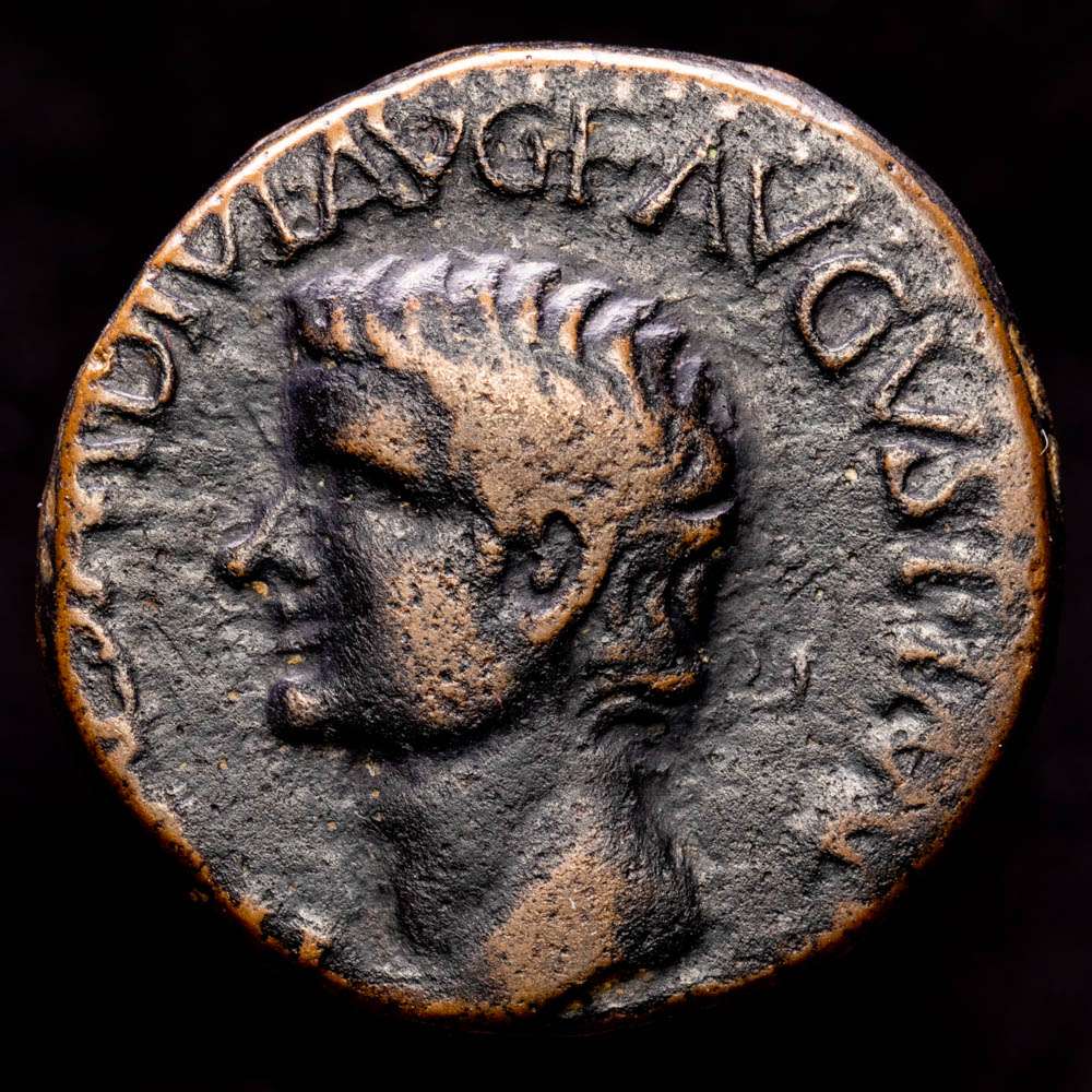 SEGOBRIGA (Saelices, Cuenca). Como. (Ee. 13,11 g/28mm). 14-36 ºC (FAB-2188). Anv: Cabeza de Tiberio a izquierda, alrededor leyenda: TI CAESAR DIVI AVG F AVGVS F IMP VIII. Rev: Leyenda: SEGO/BRIGA, dentro de láurea. MBC+.