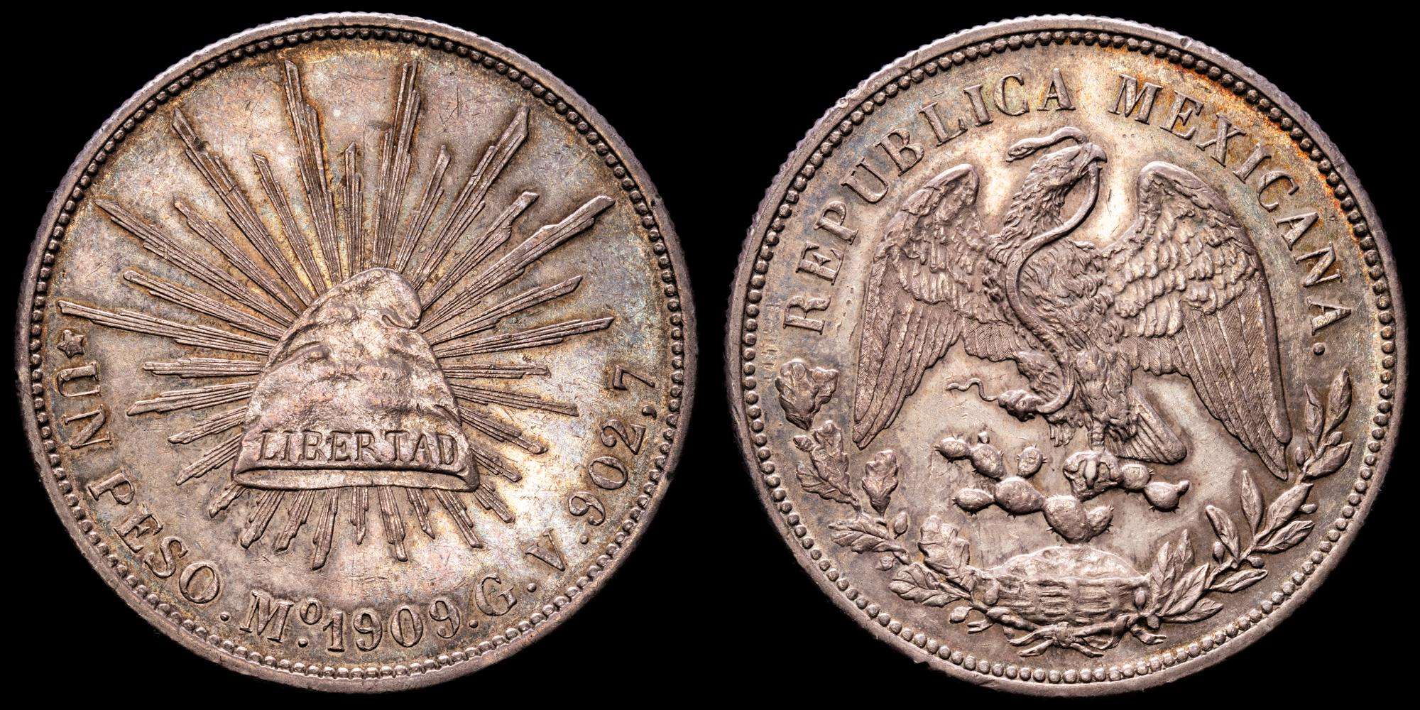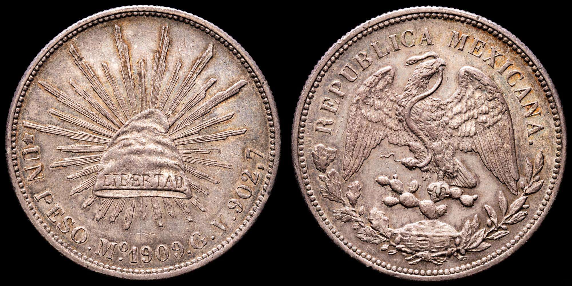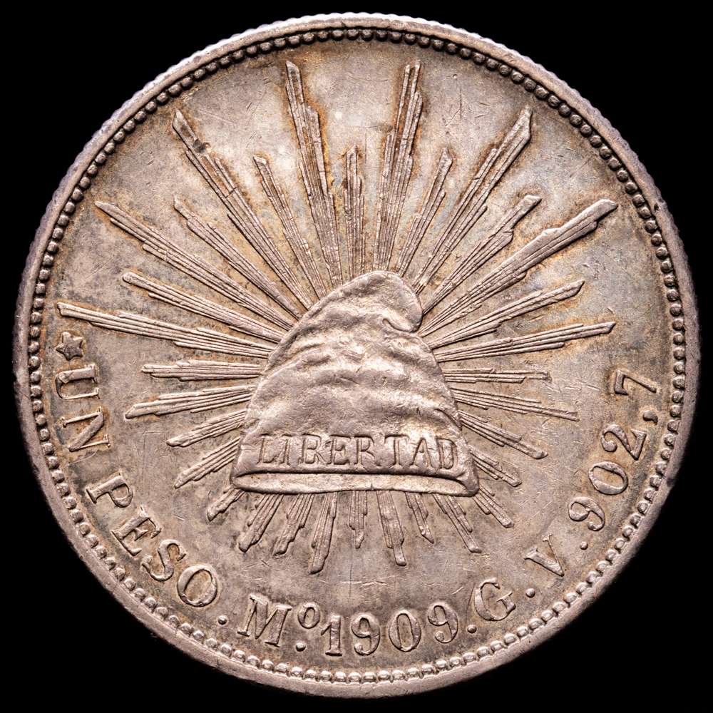 KM-409.2 – Peso 1909 México Mo GV. (27,13 gramos). Relieves superficiales bien definidos.