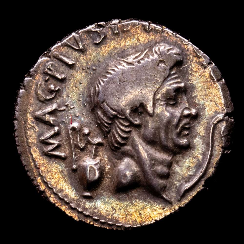 Numismática Barcala > Productos > Sexto Pompeyo. Sexo. Pompeyo Magno. Denario. 42-40 a. C. Sicilia. (Ffc-26). (Craw-511/3a). (Cal-1161). Ag. 3,88 gramos. Buen ejemplar para este tipo. Rara. EBC- Bella pátina.