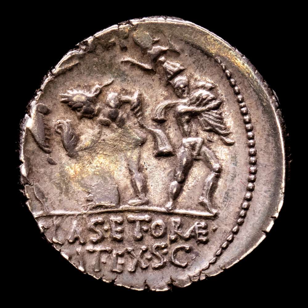 Sexto Pompeyo. Sexo. Pompeyo Magno. Denario. 42-40 a. C. Sicilia. (Ffc-26). (Craw-511/3a). (Cal-1161). Anv.: Cabeza descubierta de Pompeyo el Grande a derecha, delante: lituo, detrás: praefericulo,MAG. PIVS IMP. ITER. Rev.: Anapias y Anhphinomus trasladando a sus padres a hombros, entre ellos Neptuno, apoyando el pie sobre proa de nave, y con acrostolium en su mano, encima: PRAEF., en el exergo: CLAS. ORAE. /MÁRITO. EX. SC, (MAR entrelazadas). Ag. 3,88 gramos. Buen ejemplar para este tipo. Rara. EBC- Bella pátina.