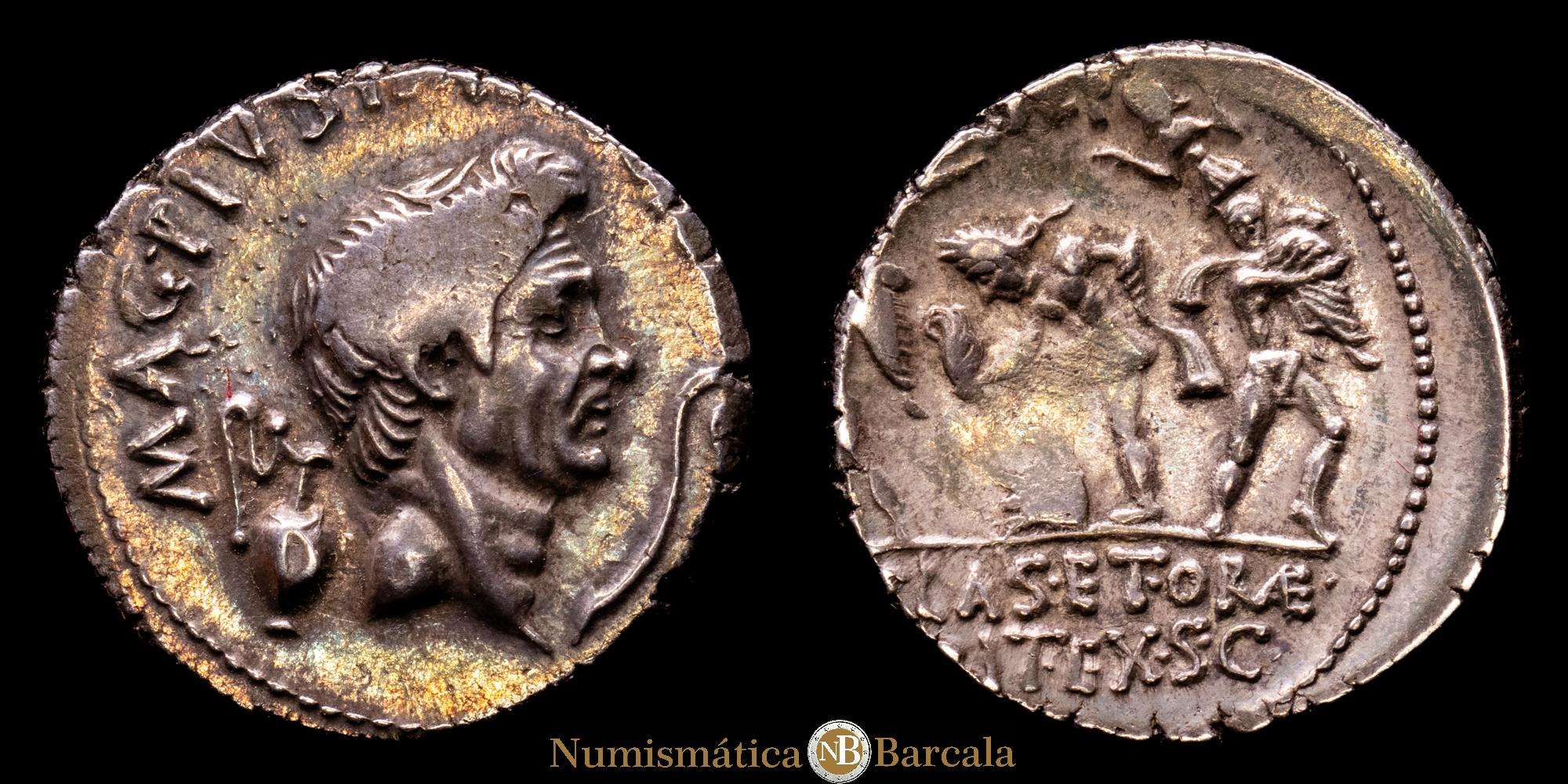 Numismática Barcala > Productos > Sexto Pompeyo. Sexo. Pompeyo Magno. Denario. 42-40 a. C. Sicilia. (Ffc-26). (Craw-511/3a). (Cal-1161). Ag. 3,88 gramos. Buen ejemplar para este tipo. Rara. EBC- Bella pátina.