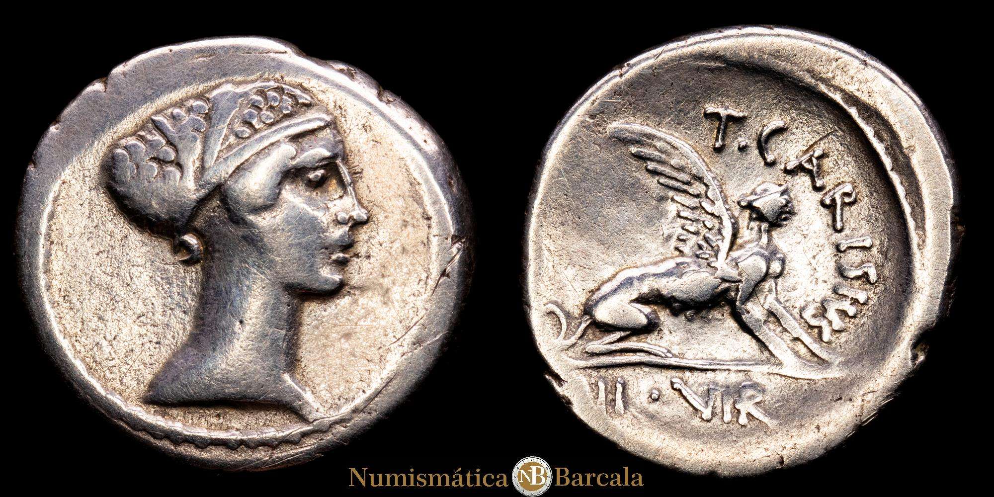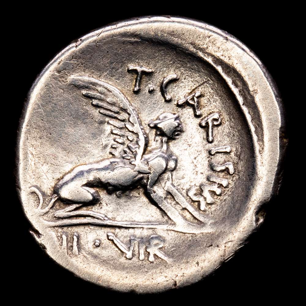T. Carisius. Denario. (3,81 g.). Roma. 46 B.C.. Cabeza de la Sibila Herófila a la derecha, cabello ricamente decorado con joyas y recogido en una cofia y atado con una banda. Reverso T•CARISIVS / III•VIR Esfinge sentada a la derecha. Babelon (Carisia) 11. Crawford 464/1. RBW 1613. Sydenham 983a. Áreas débiles y algunos arañazos, por lo demás, muy buen estado. VF.
